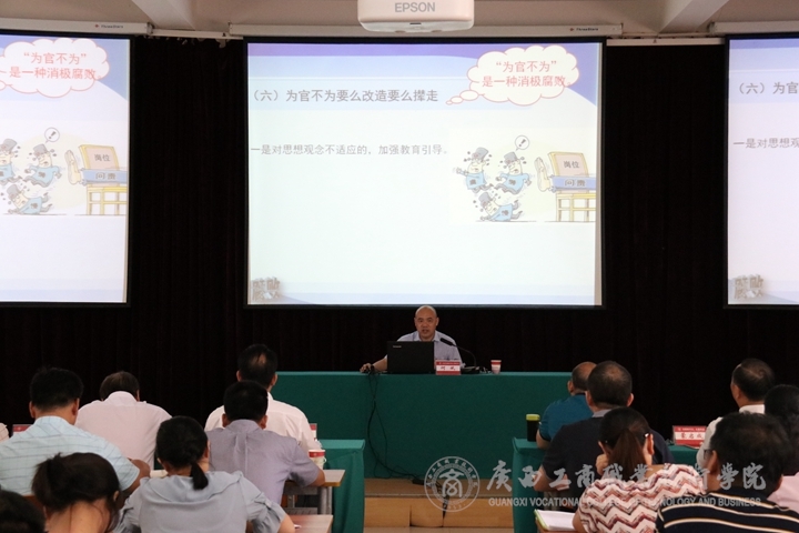 ? ? ? ? 為貫徹全面從嚴(yán)治黨要求,進(jìn)一步增強全體教職員工的廉潔意識,認(rèn)清當(dāng)前反腐敗斗爭形勢任務(wù),把握黨風(fēng)廉政建設(shè)工作重點,強化黨風(fēng)廉政建設(shè)責(zé)任和中央八項規(guī)定精神的落實。7月3日下午,學(xué)院在鵬飛校區(qū)報告廳舉辦廉潔教育專題講座。廣西壯族自治區(qū)直屬機關(guān)紀(jì)工委副書記何斌擔(dān)任主講人,現(xiàn)場為大家做“準(zhǔn)確把握全面從嚴(yán)治黨新形勢新要求 ,增強廉潔自律的自覺性和堅定性”主題報告。報告會由學(xué)院黨委副書記、紀(jì)委書記蒙啟成主持,學(xué)院領(lǐng)導(dǎo)及全體教職工現(xiàn)場聆聽了講座。