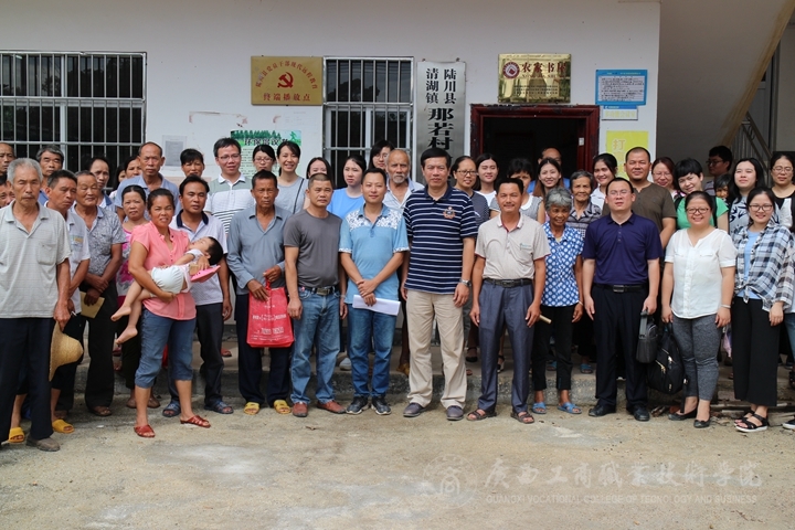 ??????? 根據(jù)學(xué)院《關(guān)于進(jìn)一步抓好精準(zhǔn)扶貧“一幫一聯(lián)”“一戶一冊(cè)一卡”工作的通知》的文件要求,2018年7月13-14日,教務(wù)科研處黨支部和財(cái)信系黨總支共同組織兩個(gè)部門(mén)30位同志到陸川縣清湖鎮(zhèn)那若村,開(kāi)展精準(zhǔn)扶貧“一幫一聯(lián)”“一戶一冊(cè)一卡”進(jìn)村入戶走訪慰問(wèn)貧困戶工作及支部共建主題黨日活動(dòng)。學(xué)院副院長(zhǎng)李維作為教務(wù)科研處黨支部成員也全程參加了活動(dòng)。