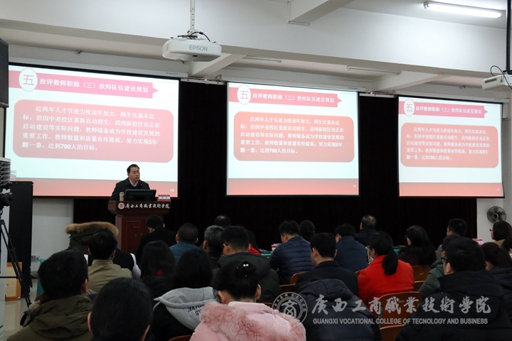 2019年1月11日,學(xué)院于鵬飛校區(qū)2145報告廳召開2018—2019學(xué)年第一學(xué)期期末大會,學(xué)院黨委書記覃武云、院長陳杰、黨委副書記、紀(jì)委書記蒙啟成、副院長李仕欽、副院長陳寧春出席,各部門、各單位負(fù)責(zé)人、全體教職工參加了會議。本次會議由覃武云書記主持。
