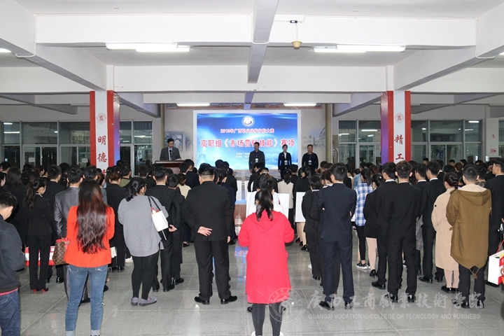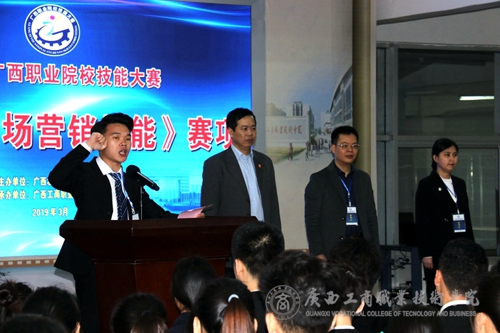 ? ? ? ? ?2019年3月23日,由廣西壯族自治區(qū)教育廳主辦,廣西工商職業(yè)技術(shù)學(xué)院承辦的“2019年廣西職業(yè)院校技能大賽(高職組)市場營銷技能賽項”啟動儀式在該校鵬飛校區(qū)文體館一樓舉行,廣西工商職業(yè)技術(shù)學(xué)院副院長李維、裁判長韋濱、裁判員代表韋荷琳、經(jīng)管系黨總支書記莫春華出席開幕式,裁判組全體成員和各參賽隊領(lǐng)隊、指導(dǎo)老師和參賽選手及相關(guān)工作人員參加開幕式。開幕式由教務(wù)科研處副處長李紅梅主持。