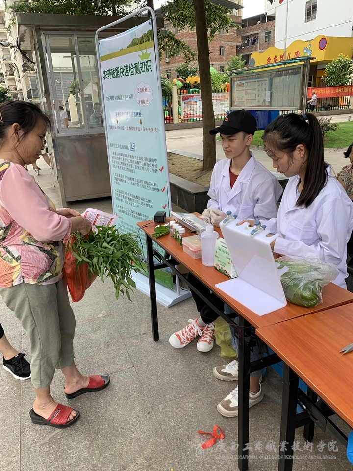 果蔬農(nóng)殘快速檢測的桌前,食檢專業(yè)的同學(xué)們在對居民們從家里拿來的蔬菜進行農(nóng)藥殘留檢測。在等待結(jié)果的過程里,同學(xué)們向居民講解如何清洗果蔬能更有效地去除農(nóng)藥殘留等一些清洗小技巧,深受社區(qū)群眾歡迎。