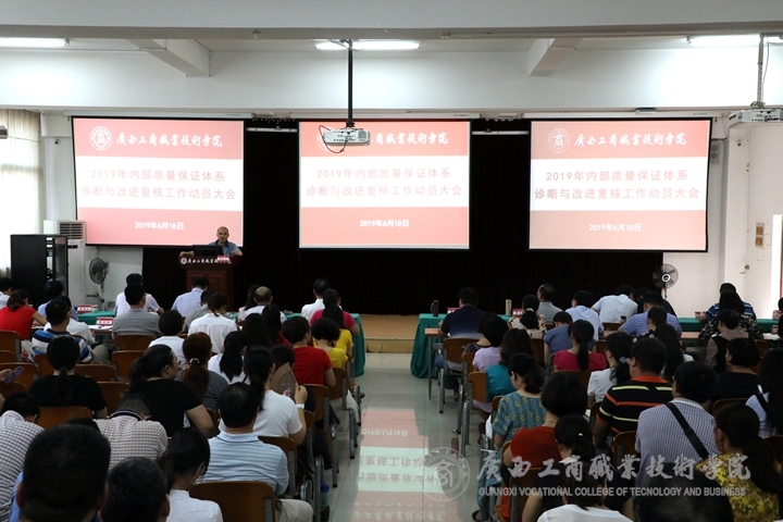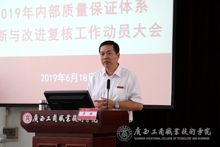 ? ? ? ? 為順利迎接學(xué)院內(nèi)部質(zhì)量保證體系診斷與改進(jìn)復(fù)核工作,2019年6月18日下午,我院于鵬飛校區(qū)教學(xué)樓報(bào)告廳召開2019年內(nèi)部質(zhì)量體系診斷與改進(jìn)復(fù)核工作動(dòng)員大會(huì),學(xué)院黨委書記覃武云、院長李維、黨委副書記、紀(jì)委書記蒙啟成出席了本次會(huì)議,全體中層干部、各系部全體教師、教務(wù)科研處、黨委教師工作部、黨委學(xué)生工作部、評估督導(dǎo)室、現(xiàn)代教育技術(shù)中心相關(guān)人員參加了本次會(huì)議。本次大會(huì)由黨委書記覃武云主持,院長李維在會(huì)上做動(dòng)員講話。?