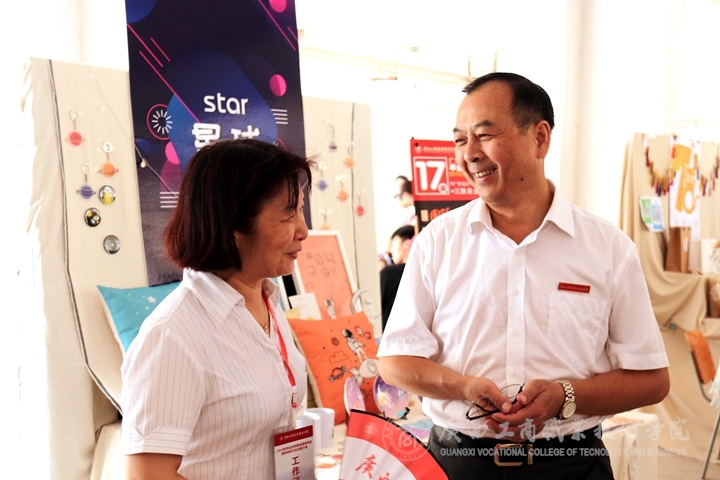 ??????? 6月29日上午,我院2019年畢業(yè)文化周之教學(xué)成果展、校史展、校友成果展演活動(dòng)在鵬飛校區(qū)舉行。學(xué)院黨委書記覃武云、院長李維、黨委副書記、紀(jì)委書記蒙啟成、副院長陳寧春親臨現(xiàn)場參觀指導(dǎo),我院89屆返校校友與學(xué)院領(lǐng)導(dǎo)一同參觀了此次展演。