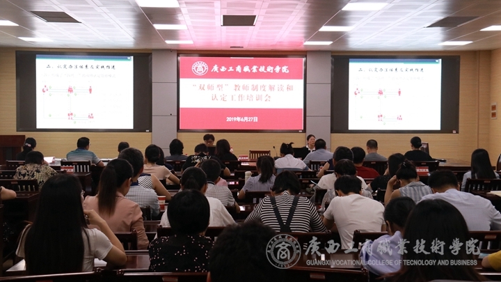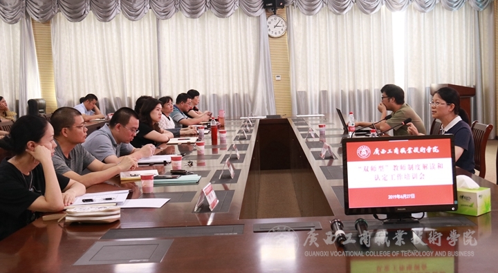 ? ? ? ? 為了貫徹中央及自治區(qū)關(guān)于高職院?!半p師型”教師培養(yǎng)的相關(guān)文件精神,建設(shè)一支教學(xué)能力和專業(yè)實踐能力兼?zhèn)涞摹半p師型”教師隊伍,結(jié)合學(xué)院“雙師型”教師申報認(rèn)定工作,2019年6月27日下午,我院于鵬飛校區(qū)視頻會議室召開2019年廣西高等職業(yè)院?!半p師型”教師認(rèn)定制度解讀和認(rèn)定工作培訓(xùn)會。?