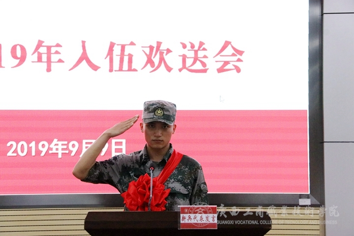 ? ? ? ? 第三項議程為新兵代表工商1708班蒙立漢同學(xué)發(fā)言。他表示很榮幸能代表即將奔赴軍營的新兵抒發(fā)戰(zhàn)士的豪情與決心。在他很小的時候有這樣一個夢想,作為一名共和國衛(wèi)兵穿上威武的軍裝,參軍的夢想已經(jīng)融入血液,融入細胞,成為心中時時刻刻澎湃的浪濤。他表示,黨和國家號召我們青年大學(xué)生積極參軍,這是歷史賦予我們的重任,也是有志青年應(yīng)該履行的義務(wù)。加強國防力量,捍衛(wèi)共和國的主權(quán)和領(lǐng)土完整,保衛(wèi)世界和平,我們就是抱著這樣的決心在報名冊上莊嚴地寫下自己的名字。