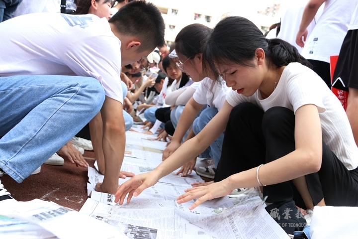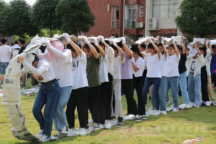 ? ? ? ? 緊接著第二個(gè)游戲“無敵風(fēng)火輪”,以分配足夠的報(bào)紙、膠帶、剪刀,用不同的方法將報(bào)紙一張張粘貼起來,必須動作迅速,完成后所有成員都要進(jìn)去,保持大家的步伐一致,同時(shí)報(bào)紙不能破損,這考驗(yàn)著各班同學(xué)的組織、協(xié)調(diào)能力以及指揮者一絲不茍的工作態(tài)度;