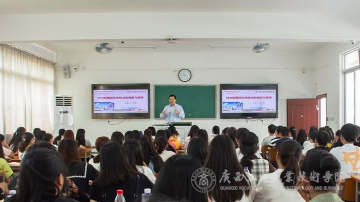 ??????? 2019年9月18日上午,廣西工商職業(yè)技術(shù)學(xué)院李維院長(zhǎng)來(lái)到了教學(xué)樓2407教室,為2019級(jí)工商企業(yè)管理專業(yè)1909和1910班新生作了題為“對(duì)當(dāng)前國(guó)際形勢(shì)熱點(diǎn)的觀察與思考”的專題授課。思政部主任劉萬(wàn)英教授,教師代表岑郁、劉源益、韋慧妮、龔麗萍、王興華、莫曉靜、李榮真、韋靜、羅嚴(yán)嚴(yán)、李明聆聽(tīng)了授課。
