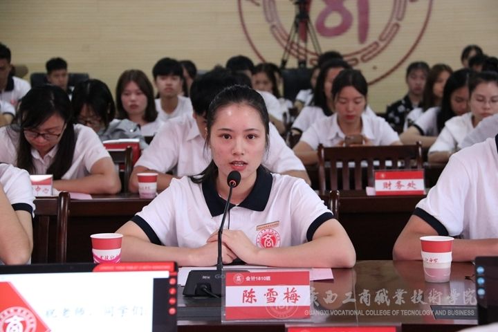 ??????? 接著,由會計系1810班陳雪梅、會計系1814班呂剛同學(xué)、會計系1809班的黃雪珍同學(xué)、經(jīng)管系營銷1806班溫富良同學(xué)作為學(xué)生代表發(fā)言。他們紛紛表示,為同學(xué)服務(wù)是自己的初心和使命,在日后工作中,更要秉承這種初心和使命。黃雪珍同學(xué)表示,生活在幸福和平年代,我們應(yīng)勇于擔(dān)負(fù)時代新使命,青年強,則國家強!中華民族偉大復(fù)興夢,強國夢需要全員踐行。作為一名退伍軍人的溫富良表示,退伍不褪色,做好自己的本分,當(dāng)下學(xué)習(xí)是自己重要的目標(biāo),才能更好歷練人生無所不在的挑戰(zhàn)。???