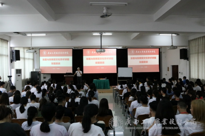 ??????? 2019年10月11日下午,我院在鵬飛校區(qū)報告廳舉辦了主題為“東盟漫談”的文化學(xué)術(shù)講座。本次講座特別邀請到廣西日報傳媒集團駐東盟國際傳媒聯(lián)絡(luò)專員、第十一屆廣西壯族自治區(qū)政協(xié)委員,廣西民建藝術(shù)團團長,廣西禮儀文化交流協(xié)會常務(wù)副會長,歷屆中國-東盟禮儀大賽組委會副主席林涌泉主任主講。講授東盟相關(guān)課程的教師及學(xué)生社團骨干約200人參加了本次講座。講座由教務(wù)科研處副處長李紅梅教授主持。