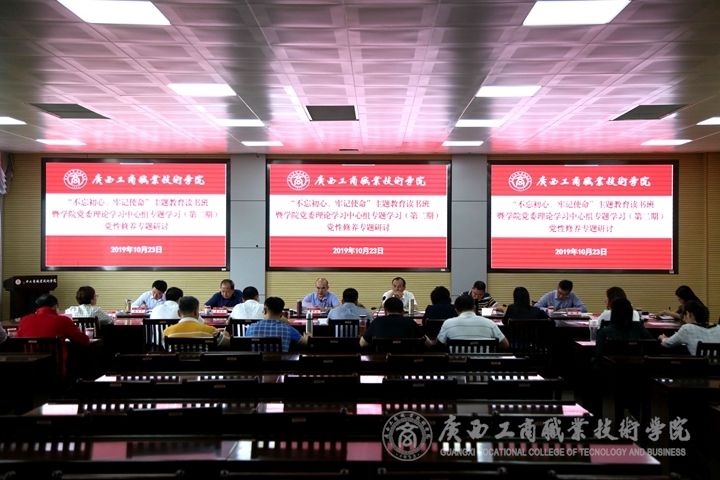 ???????10月23日下午,中共廣西工商職業(yè)技術(shù)學院委員會召開第二期“不忘初心、牢記使命”主題教育讀書班暨學院黨委理論學習中心組專題研討的黨性修養(yǎng)專題研討會。學院領導,黨委委員,學院各部門、各單位主要負責人(中共黨員),學院工會、團委主要負責人,其他處級以上的黨委領導干部參加了研討,學院黨委書記覃武云主持本次專題研討。