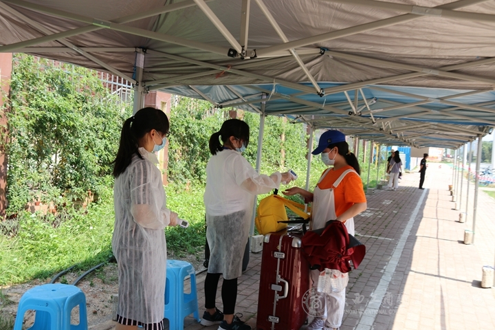 學(xué)子們陸續(xù)前來報到了,只見他們帶著行李,戴著口罩,踏進安置在校門口的帳篷中,根據(jù)地上貼好的指示標(biāo)識,按1.5米間隔排隊等待著。在秩序引導(dǎo)員的指引下,先由工作人員對他們測量體溫,隨后行李消殺員對其行李進行消殺,同學(xué)們再來到“口罩換取點”,取掉原口罩,放進“口罩專用丟棄箱”,用免洗消毒液給雙手消毒,自取一個學(xué)院配發(fā)的新口罩戴上,隨后有序排隊到“第一次測溫點”測溫。