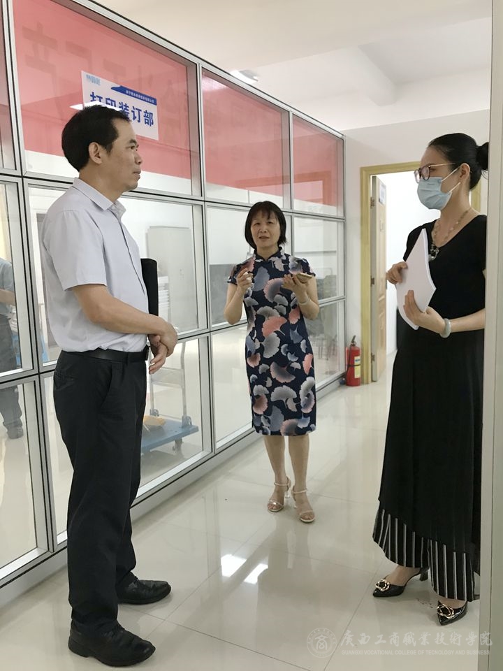 2020年6月11日下午,自治區(qū)糧食和物資儲備局副局長李國平在覃武云書記和李維院長的陪同下,參觀了學院會計系“智慧會計工廠產教融合”實訓基地。會計系副主任粟衛(wèi)紅向李國平副局長一行介紹了實訓基地的運行模式和校企合作的情況,講解了共享財務平臺與傳統(tǒng)會計賬務處理的區(qū)別。正在基地帶領學生開展實訓的南寧橙米商務服務有限公司的會計部經理江琴也向幾位領導介紹了企業(yè)的情況和學生實習實訓的情況。李國平副局長還饒有興致的觀看了全自動裝訂機的操作,充分肯定了學校和會計系在深化產教融合方面取得的成效。覃武云書記和李維院長也分別對會計系的教學、科研、校企合作等工作提出了要求。