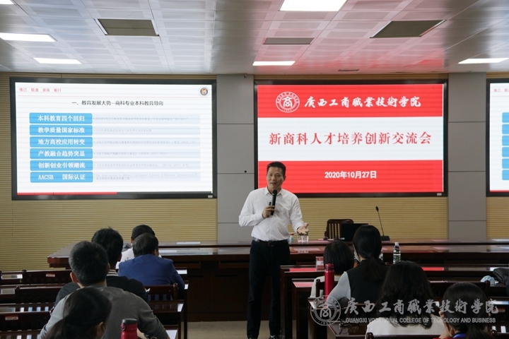 2020年10月27日上午,在鵬飛校區(qū)教學(xué)樓2119會議室舉辦主題為“新商科人才培養(yǎng)”的創(chuàng)新交流會,并邀請兩位校外專家對校內(nèi)老師和2020年廣西高職院校技能大賽企業(yè)管理模擬沙盤賽項指導(dǎo)老師進(jìn)行講座和交流指導(dǎo),他們分別是廣西財經(jīng)學(xué)院人事處處長(原工商管理學(xué)院院長)梁儒謙教授、南寧師范大學(xué)職業(yè)技術(shù)教育學(xué)院數(shù)字媒體技術(shù)系主任鄭小軍教授。本次交流會由我校經(jīng)貿(mào)學(xué)院院長張煌強(qiáng)主持。