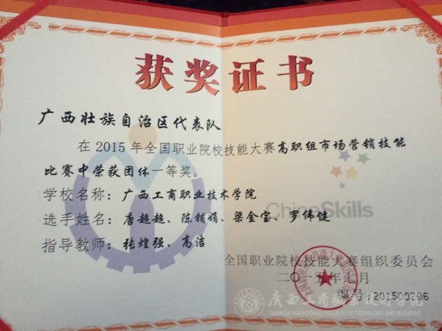 據(jù)來(lái)自無(wú)錫的最新消息,我院市場(chǎng)營(yíng)銷(xiāo)代表隊(duì)在今天下午剛剛結(jié)束的2015年全國(guó)職業(yè)院校技能大賽高職組市場(chǎng)營(yíng)銷(xiāo)技能比賽中榮獲團(tuán)體一等獎(jiǎng)!這是我院首次在同一類(lèi)別的國(guó)賽中榮獲一等獎(jiǎng)!也是今年廣西參賽團(tuán)隊(duì)在高職組市場(chǎng)營(yíng)銷(xiāo)技能比賽中所獲得的唯一一個(gè)一等獎(jiǎng)!