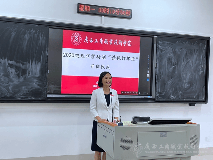 儀式開始,首先由會計學院院長粟衛(wèi)紅向大家介紹了現(xiàn)代學徒制訂單班的設(shè)立初衷和人才培養(yǎng)目標,并向企業(yè)導師團隊和學生提出希望和要求。希望導師團隊要以立德樹人為根本,把自己豐富的工作經(jīng)驗、愛崗敬業(yè)的奉獻精神通過言傳身教的方式傳遞給徒弟學員;學員要虛心向師傅學習,勤奮學習、刻苦鉆研,秉承工匠精神,不斷豐富自我,完善自我。隨后,精振公司總經(jīng)理鐘思敏向大家介紹了參加本次開班式的各位企業(yè)導師?、公司文化、培育人才理念,并與同學們分享了職業(yè)生涯規(guī)劃和專業(yè)前景。