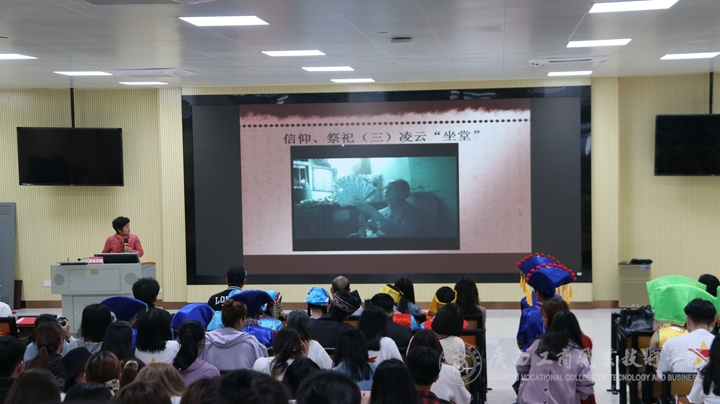 講座在師生合唱的《唱支山歌給黨聽》中拉開帷幕,徐教授從壯族的人口、分布、語言以及民族民歌的文化特征入手,通過在全區(qū)采風(fēng)拍到、錄到的歌圩、對(duì)歌的影音資料,與同學(xué)們以互動(dòng)的形式,共同感受了民歌的過去現(xiàn)在未來,為在場師生講了一場生動(dòng)的民族文化講座。徐教授講課過程中隨口哼唱的民歌小調(diào),屢屢引得現(xiàn)場師生和聲合唱,引發(fā)了課堂的一個(gè)個(gè)小高潮。講座上,她以文化品牌“印象劉三姐”為例教育我院學(xué)生,要發(fā)揚(yáng)商院學(xué)科特色,利用好廣西“東盟橋頭堡”的區(qū)位優(yōu)勢(shì),經(jīng)營好“原生態(tài)”的文化產(chǎn)業(yè)。同時(shí)要厚植愛國情懷,提升文化自覺、樹立文化自信、不斷提高文化軟實(shí)力,保障好文化安全和民族安全?;顒?dòng)現(xiàn)場,師生們還表演了極具民族特色的竹竿舞、拋繡球和民歌獨(dú)唱、對(duì)唱節(jié)目。