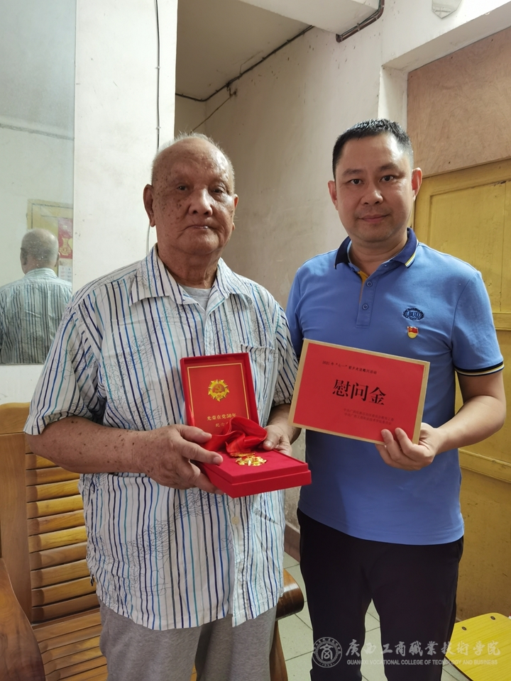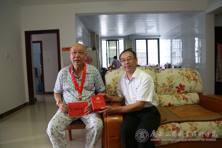 6月28日,蒙啟成帶隊來到81歲的老黨員覃澤光同志家中,與老人拉家常、聊生活、談發(fā)展,細心詢問覃老師身體狀況如何,精神狀態(tài)如何,叮囑他要時刻注意保重身體,適度鍛煉,同時要保持樂觀積極心態(tài)。蒙副書記為覃老師佩戴在黨50周年紀念章,并送上慰問金向他致以節(jié)日祝福。