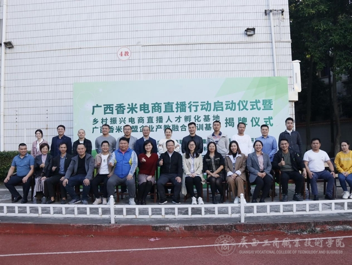 為推進(jìn)學(xué)校產(chǎn)教融合、校企合作水平,有效提升我校電商專(zhuān)業(yè)學(xué)生職業(yè)技能,更好服務(wù)廣西香米聯(lián)盟企業(yè),11月18日下午,由廣西香米產(chǎn)業(yè)研究院聯(lián)合廣西糧食行業(yè)協(xié)會(huì)、廣西香米聯(lián)盟企業(yè)、廣州綠田園農(nóng)業(yè)科技有限責(zé)任公司承辦的廣西香米電商直播行動(dòng)啟動(dòng)儀式暨鄉(xiāng)村振興電商直播人才孵化基地、廣西香米聯(lián)盟企業(yè)產(chǎn)教融合實(shí)訓(xùn)基地揭牌儀式在我校中堯校區(qū)成功舉辦。學(xué)院副院長(zhǎng)闕勇平、廣西香米產(chǎn)業(yè)研究院副院長(zhǎng)張煌強(qiáng)、廣州綠田園農(nóng)業(yè)科技有限公司副董事長(zhǎng)戴春燕、廣西糧食行業(yè)協(xié)會(huì)副秘書(shū)長(zhǎng)羅桂嬌及十八家廣西香米產(chǎn)業(yè)聯(lián)盟企業(yè)代表參加儀式。