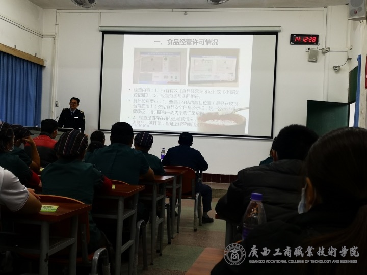 武鳴校區(qū)培訓會上,武鳴區(qū)市場監(jiān)督管理局城北所熊紹永所長對武鳴校區(qū)食堂全體從業(yè)人員進行了校園食品安全培訓——餐飲環(huán)節(jié)食品安全相關要求及標準專題培訓,主要從餐飲環(huán)節(jié)食品安全監(jiān)管的重要性、餐飲環(huán)節(jié)食品安全基本情況及存在的突出問題、餐飲環(huán)節(jié)食品安全基本標準和要求三大方面深入淺出的講解了食品安全相關知識。同時,也舉例說明監(jiān)督檢查過程中發(fā)現(xiàn)的校園食堂存在食品安全問題,學法規(guī),明職責,學案例,促警醒。