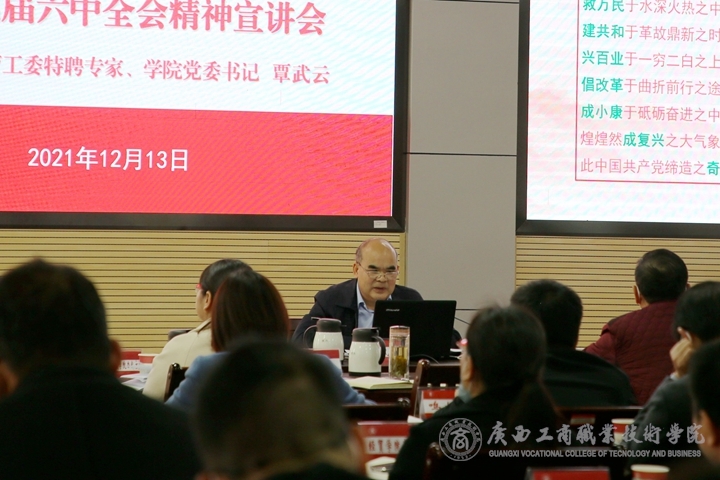 12月13日下午,我院在鵬飛校區(qū)2119會(huì)議室舉辦黨的十九屆六中全會(huì)精神宣講報(bào)告會(huì),自治區(qū)黨委教育工委特聘專家、我院黨委書記覃武云作專題報(bào)告。學(xué)院領(lǐng)導(dǎo),全體中層以上干部及師生代表參加。