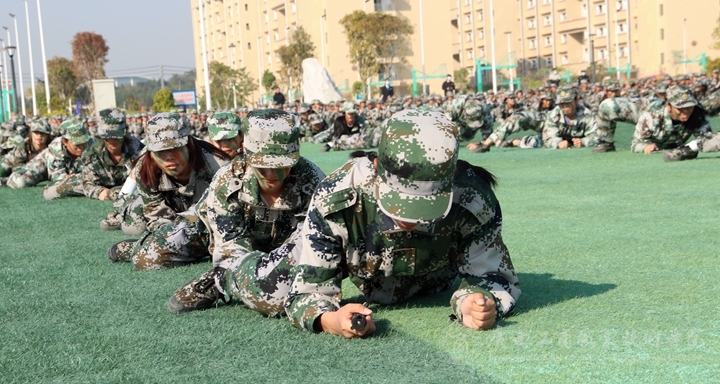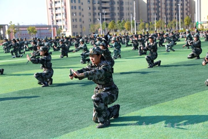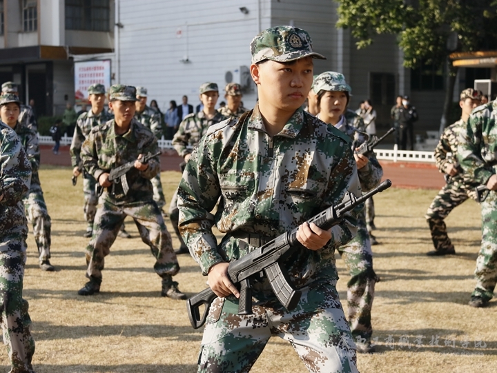首先全體起立,奏、唱國歌,五星紅旗冉冉升起,大會(huì)拉開了帷幕。伴隨著雄壯的閱兵進(jìn)行曲,軍訓(xùn)匯報(bào)表演開始,2021級(jí)新生組成的各方塊隊(duì)伍依次進(jìn)行分列式表演,他們穿著整齊的軍裝,邁著堅(jiān)定的步伐,喊著嘹亮的口號(hào)依次通過主席臺(tái),接受檢閱。匯報(bào)表演編字方塊隊(duì)倒數(shù)計(jì)時(shí)隊(duì)后,表演方塊隊(duì)依次進(jìn)行列隊(duì)、軍拳術(shù)、刺術(shù)、持槍在煙霧彈中匍匐前進(jìn)匯報(bào)等戰(zhàn)術(shù)表演,展現(xiàn)了同學(xué)們刻苦訓(xùn)練取得的驕人成果。