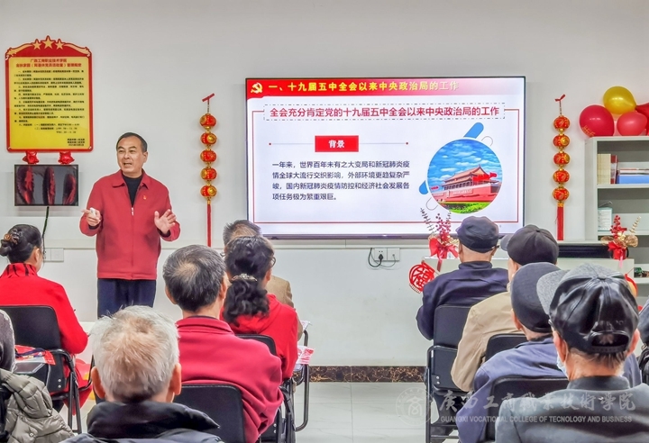 2022年1月6日上午,學(xué)院黨委副書記蒙啟成同志在中堯路校區(qū)“金秋家園”離退休黨員活動(dòng)室向離退休老同志宣講黨的十九屆六中全會(huì)精神。離退休老黨員、老干部、老職工代表近50人到場(chǎng)聆聽(tīng),同時(shí)在離退休老同志工作交流群轉(zhuǎn)播。