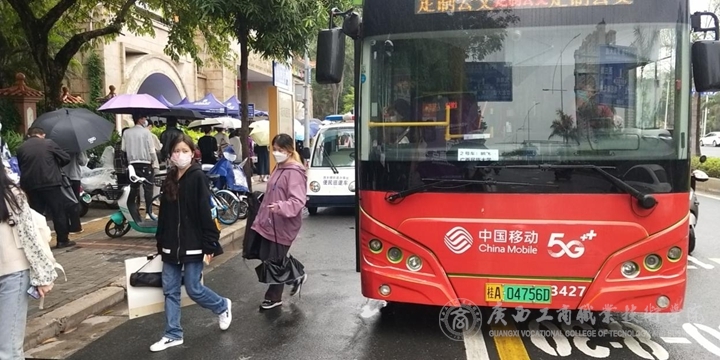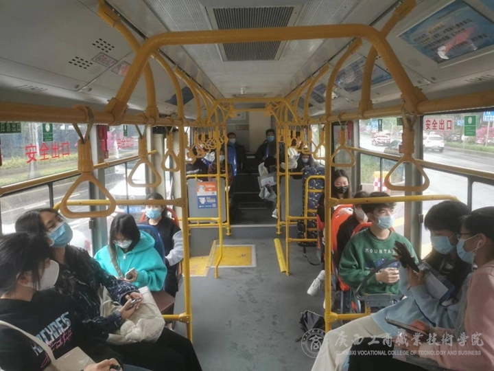 考試當(dāng)天,學(xué)院共安排32位教師,28名學(xué)生志愿者,26輛車,分成六條線路,將我院考生按時(shí)送到各個(gè)考點(diǎn)。為了保證每一個(gè)考生的安全,每一輛車都跟隨一名帶隊(duì)教師。帶隊(duì)教師在上車前再三確認(rèn)每一位考生的考點(diǎn)以及提醒考生攜帶準(zhǔn)考證,出示健康碼、行程碼和核酸陰性檢測(cè)報(bào)告。當(dāng)考生考完試,帶隊(duì)教師再次進(jìn)行人員清點(diǎn),確保每一名考生順利返回。送考的那兩天,有同學(xué)對(duì)老師說:“別的學(xué)校的考生看到我們有專車接送,都投來羨慕的目光,紛紛詢問我們是哪個(gè)學(xué)校的。我驕傲地和他們說,我是廣西工商職業(yè)技術(shù)學(xué)院的學(xué)生。”