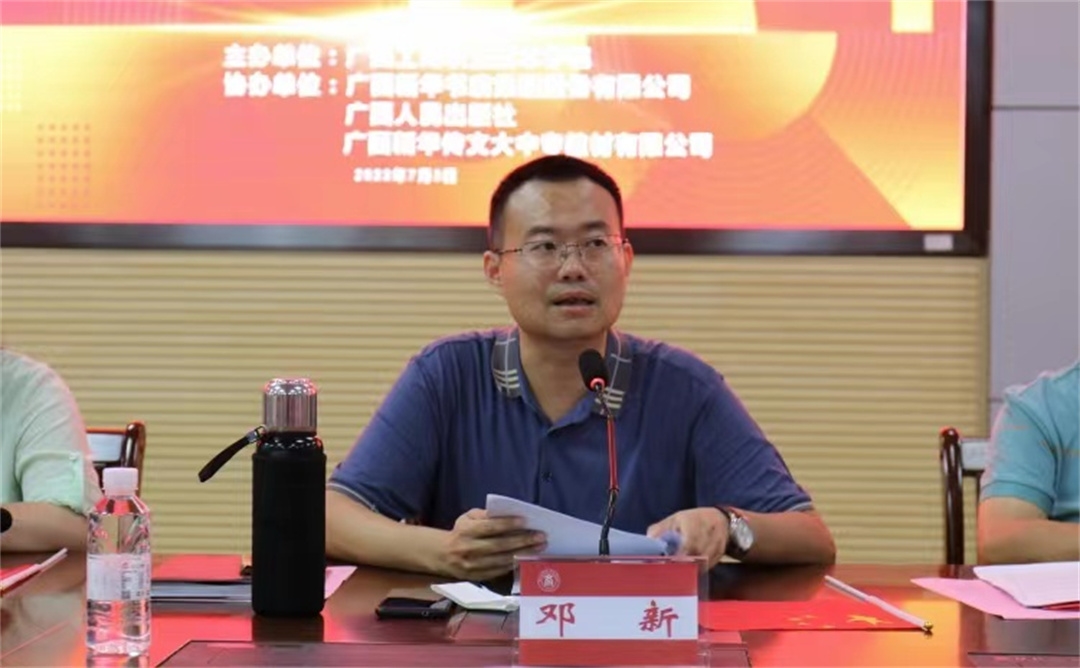 2022年7月3日,“立德樹人潤(rùn)青心 經(jīng)典書香育心人”紅色閱讀分享交流會(huì)在我院2119會(huì)議室舉行,自治區(qū)黨員教育中心四級(jí)調(diào)研員鄧新、廣西人民出版社副社長(zhǎng)蔣文娜、廣西新華傳文大中專教材公司總經(jīng)理廖愛娟到我校參加分享會(huì)。學(xué)院副院長(zhǎng)安仲文、學(xué)院團(tuán)委相關(guān)老師及青年馬克思主義培養(yǎng)工程培訓(xùn)班全體學(xué)員共同出席本次會(huì)議。