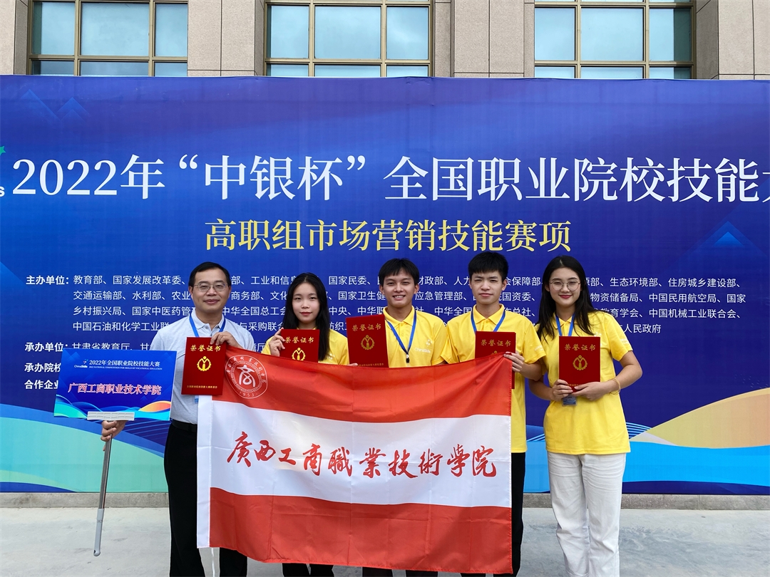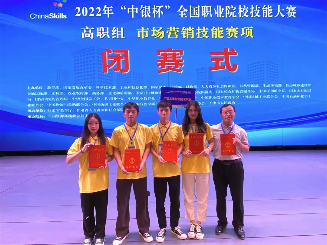 2022年8月25—26日,由教育部等多個(gè)部門(mén)聯(lián)合主辦的2022年全國(guó)職業(yè)院校技能大賽高職組“市場(chǎng)營(yíng)銷(xiāo)技能”賽項(xiàng)在甘肅蘭州資源環(huán)境職業(yè)技術(shù)大學(xué)舉行。經(jīng)過(guò)緊張激烈角逐,由劉結(jié)玲、張煌強(qiáng)兩位老師指導(dǎo),馬志才、熊孟杰、趙嘉林、陳心雨四位同學(xué)組成的團(tuán)隊(duì)代表廣西壯族自治區(qū)參賽,經(jīng)過(guò)兩天全力比拼,在全國(guó)56所高職院校中脫穎而出,喜獲二等獎(jiǎng)。