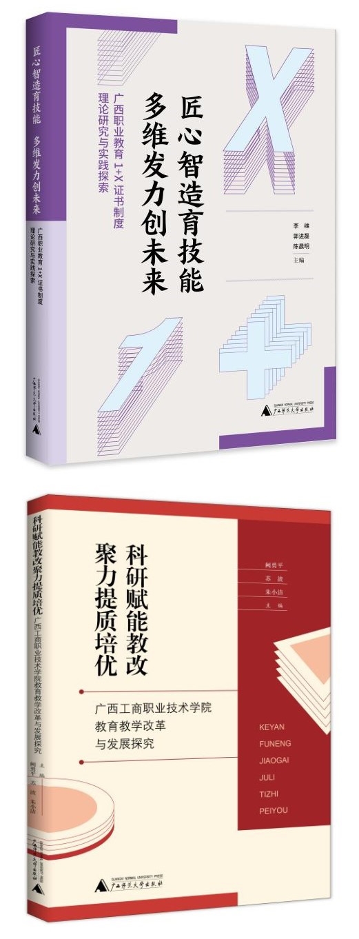 會后,還進行了學(xué)院教育教學(xué)改革探索成果發(fā)布:2022年學(xué)院教師凝心聚力,公開出版了《匠心制造與技能 多維發(fā)力創(chuàng)未來——廣西職業(yè)教育1+X證書制度理論研究與實踐探索》《科研賦能教改 聚力提質(zhì)培優(yōu)——廣西工商職業(yè)技術(shù)學(xué)院教育教學(xué)改革與發(fā)展探究》兩部著作。