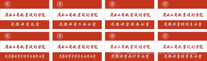 在道德講堂硬件布置上,我院突出 “以德育商”元素,體現(xiàn)商院特色,設計了專門的“道德講堂”統(tǒng)一LOGO標識、講堂背景板、道德箴言掛板及紀念品。并為道德講堂總堂、工會分堂、團委分堂、學院學生組織分堂、學院學生社團分堂和各系分堂制作了專門的“廣商育人紅”道德講堂旗幟。