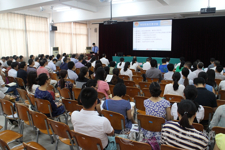 張堅局長在講座中結(jié)合自身多年從事檢察工作的豐富經(jīng)驗,列舉了當(dāng)今社會大量的典型案例,全面、生動、形象地為大家深刻剖析了當(dāng)前職務(wù)犯罪的形勢、職務(wù)犯罪易發(fā)的心理、職務(wù)犯罪的危害、認(rèn)定受賄罪的若干問題、高校職務(wù)犯罪常見問題及案例等職務(wù)犯罪相關(guān)問題。講座中還播放了相關(guān)案例視頻及廉政宣傳短片、公益廣告。張堅局長以極其嚴(yán)謹(jǐn)科學(xué)的態(tài)度、風(fēng)趣幽默的方式、振聾發(fā)聵的效果為與會的干部作了一次生動的預(yù)防職務(wù)犯罪專題講座,使大家受到了強(qiáng)烈的震撼和深刻的教育。