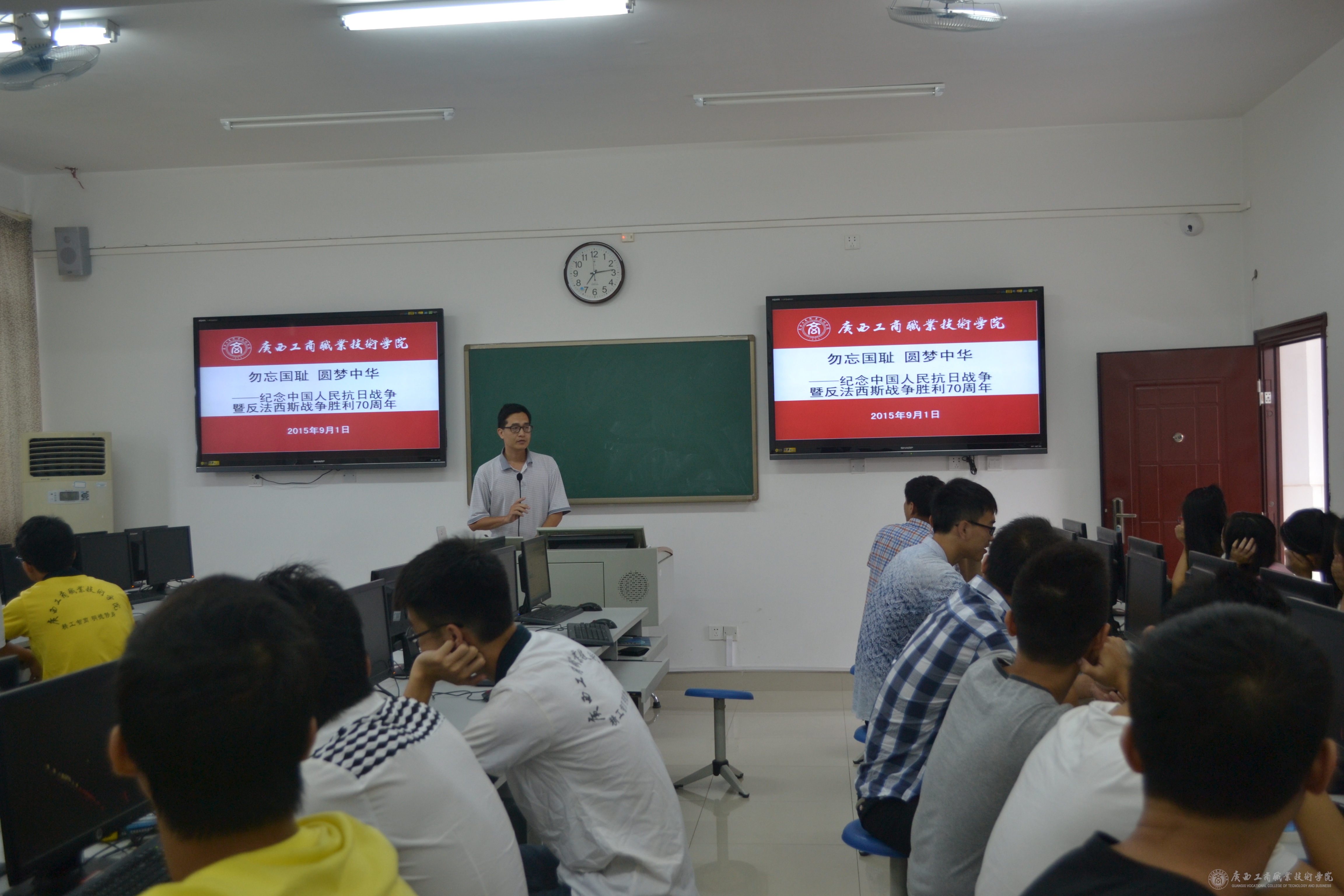 在開學(xué)的第一周中,我系教師在同學(xué)們的假期結(jié)束返校的第一課上,利用課前10分鐘或者課間10分鐘,為同學(xué)們簡單的講述了抗日戰(zhàn)爭的歷史以及抗戰(zhàn)勝利的偉大意義,并為同學(xué)們播放了由中央電視臺、軍事科學(xué)院政治部、江蘇省廣播電視總臺、陜西廣播電視臺等單位聯(lián)合拍攝的八集大型紀(jì)錄片《東方主戰(zhàn)場》的第一集《東方危急》的一小段,并讓同學(xué)們利用課余的時間,自行觀看這部紀(jì)錄片,了解歷史,勿忘國恥,要繼承和弘揚抗日民族統(tǒng)一戰(zhàn)線優(yōu)良傳統(tǒng)。