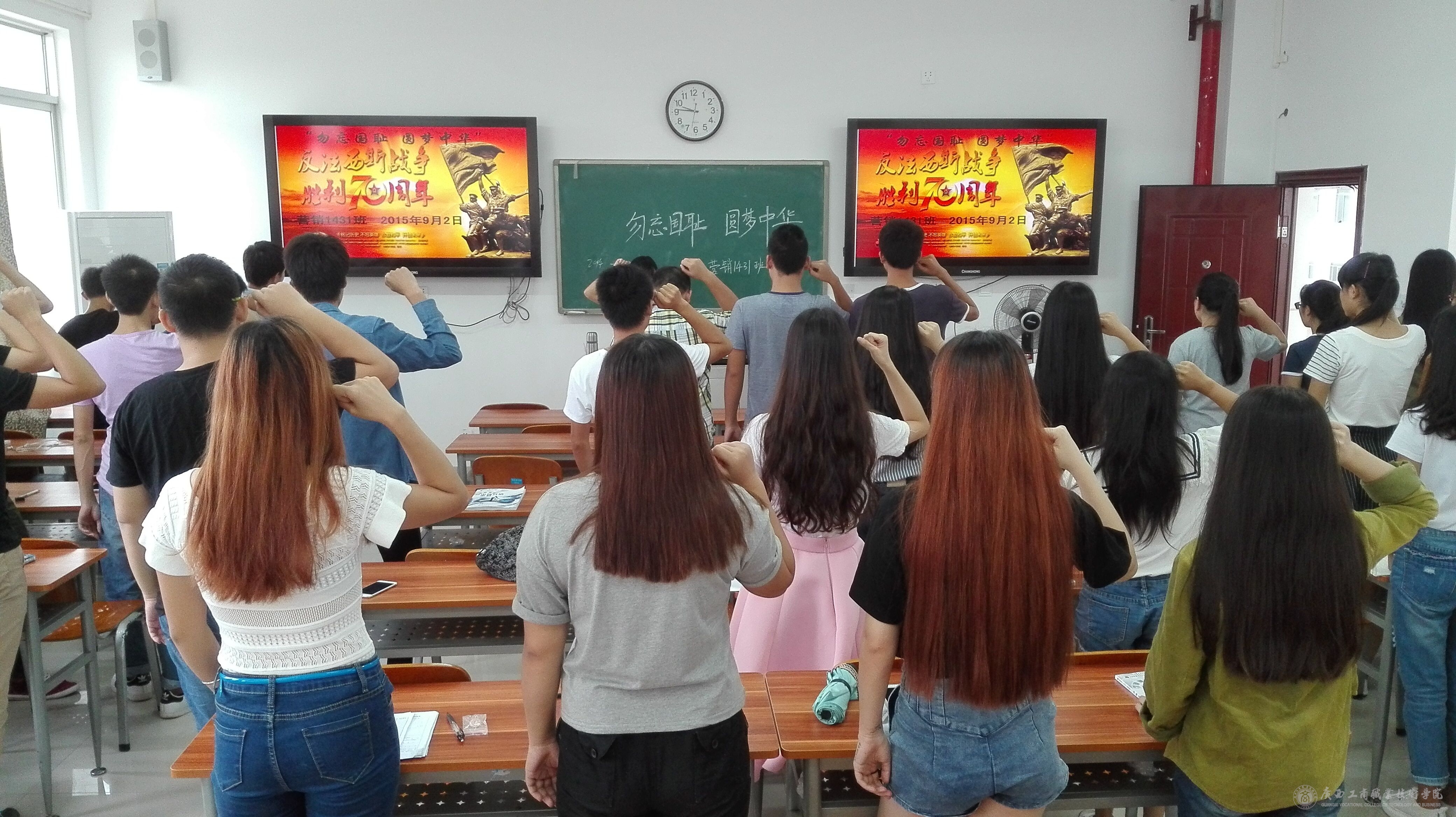 圖為營銷1431班全體同學(xué)和班主任進(jìn)行愛國宣誓