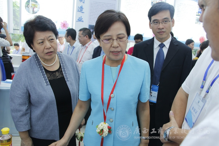 教育部副部長(zhǎng)魯昕、廣西副主席李康等領(lǐng)導(dǎo)觀看了我院的食品檢測(cè)展示臺(tái)。在我院廣告設(shè)計(jì)展示處,魯昕副部長(zhǎng)與2015年獲全國(guó)高職市場(chǎng)營(yíng)銷職業(yè)技能競(jìng)賽團(tuán)體獎(jiǎng)一等獎(jiǎng)的成員之一陳鋪娟親切交流,陳鋪娟同學(xué)向魯昕副部長(zhǎng)簡(jiǎn)單介紹了我院的職業(yè)教育展示特色,魯昕副部長(zhǎng)表?yè)P(yáng)陳鋪娟是個(gè)優(yōu)秀的學(xué)生,并一同合影留念。