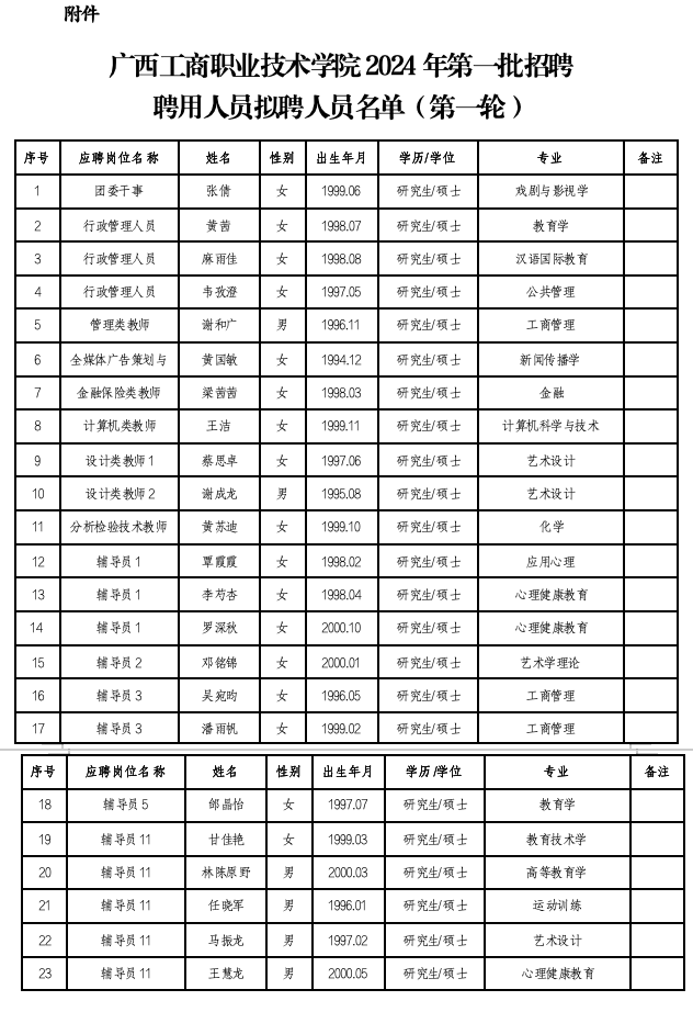 附件:廣西工商職業(yè)技術學院2024年第一批招聘聘用人員擬聘人員名單(第一批)