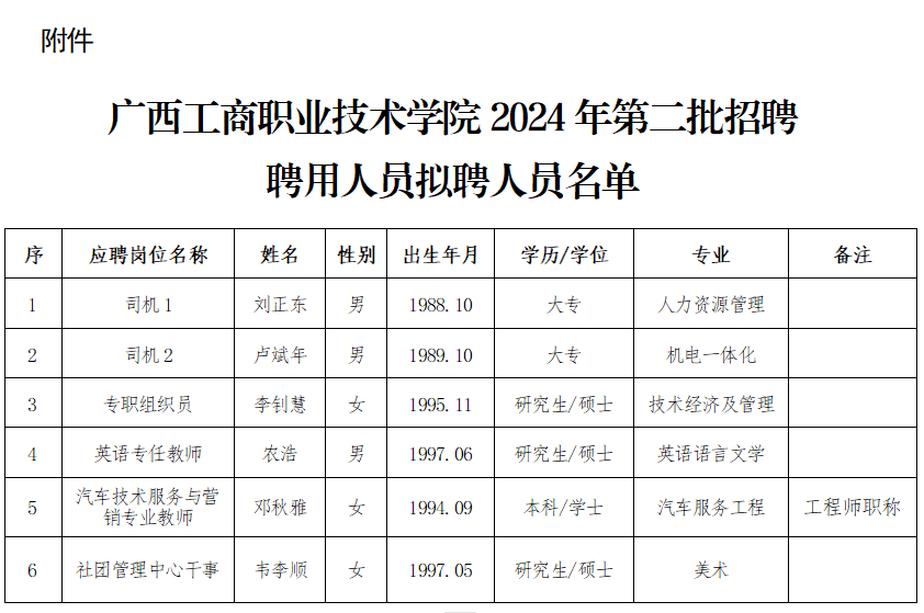 附件:廣西工商職業(yè)技術(shù)學院2024年第二批招聘聘用人員擬聘人員名單