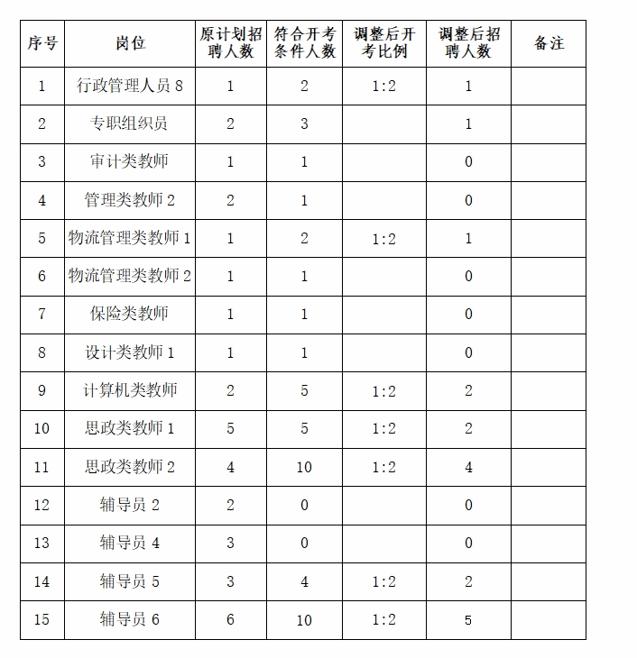 (八)輔導(dǎo)員6崗位開考比例調(diào)整為1:2,招聘人數(shù)由6人減少至5人。