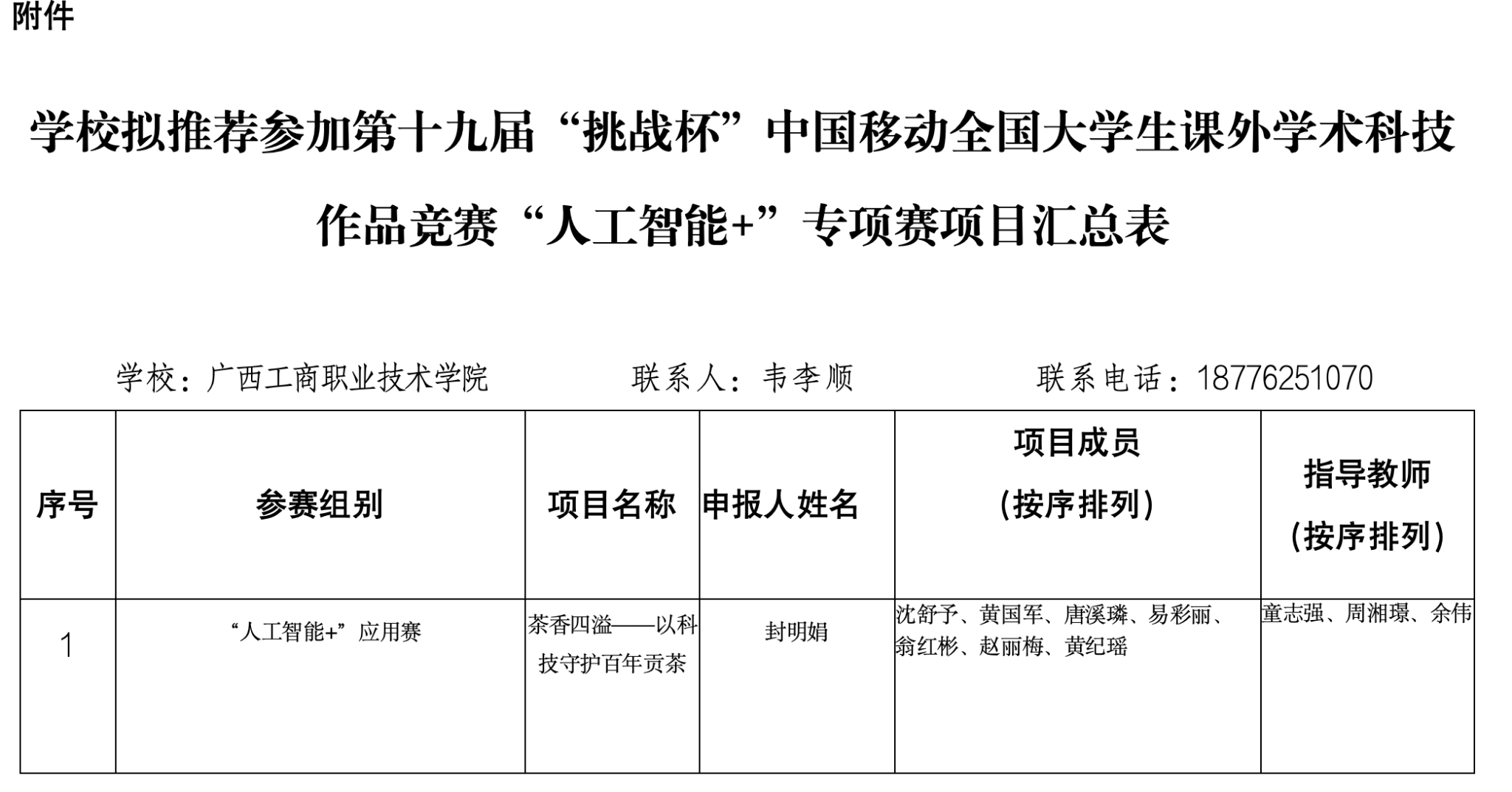 根據(jù)《關于參加第十九屆“挑戰(zhàn)杯”中國移動全國大學生課外學術科技作品競賽“人工智能+”專項賽的工作指引》,經學生自主報名提交作品,學校遴選,擬推薦《茶香四溢——以科技守護百年貢茶》至共青團廣西區(qū)委、全國組委會參加評審,現(xiàn)進行公示,詳見附件。