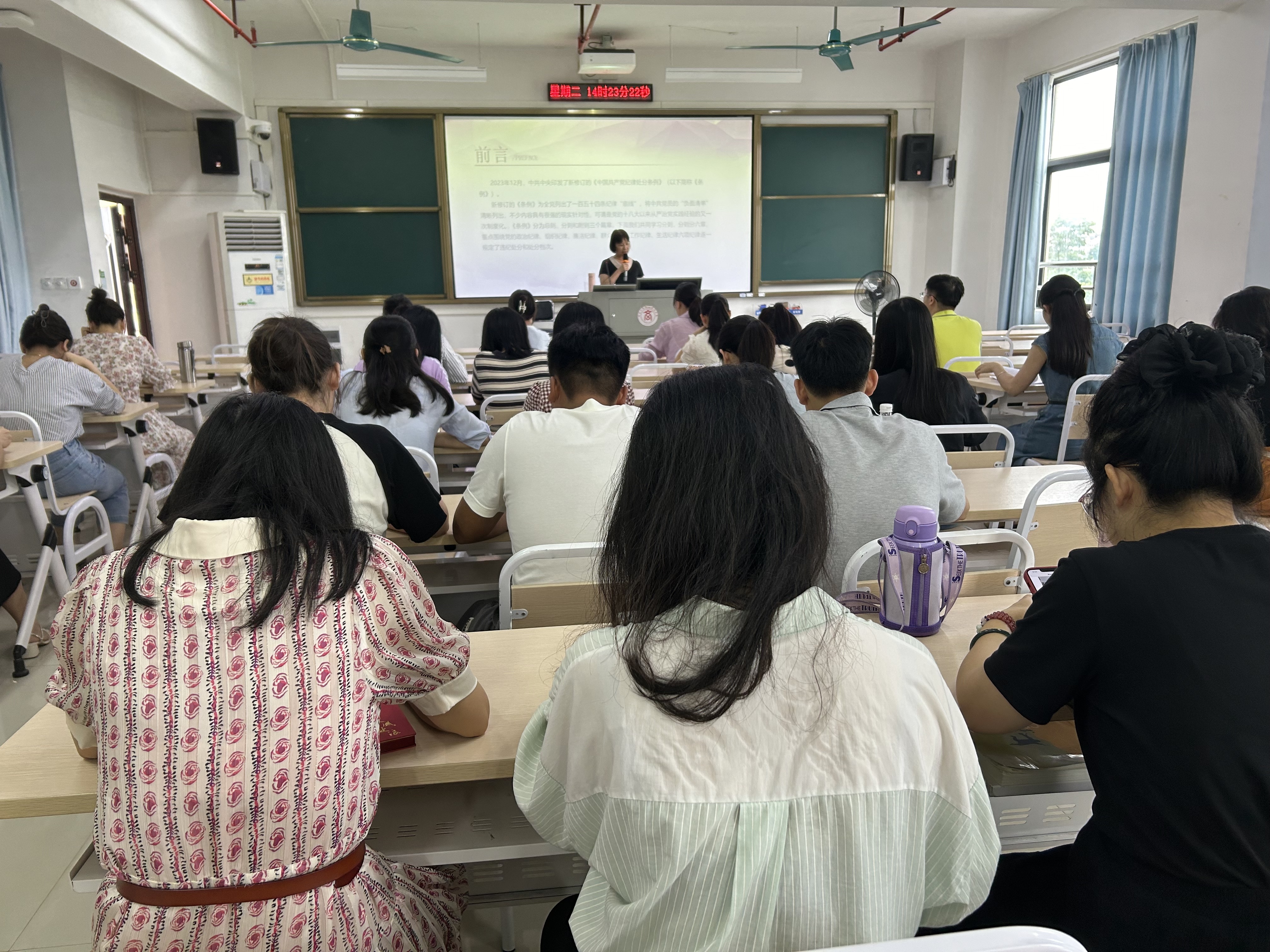 為推動黨紀學習教育走深走實 ,深入學習貫徹習近平總書記關于黨紀學習教育的重要講話和重要指示精神,認真貫徹落實黨中央、自治區(qū)黨委、學校黨委關于黨紀學習教育的有關工作部署要求,慶祝中國共產黨成立103周年,6月25日下午,由會計學院黨總支書記粟衛(wèi)紅在A1-302作題為《嚴守六項紀律 筑牢紀律防線》紀律黨課,全體教師黨員參與。
