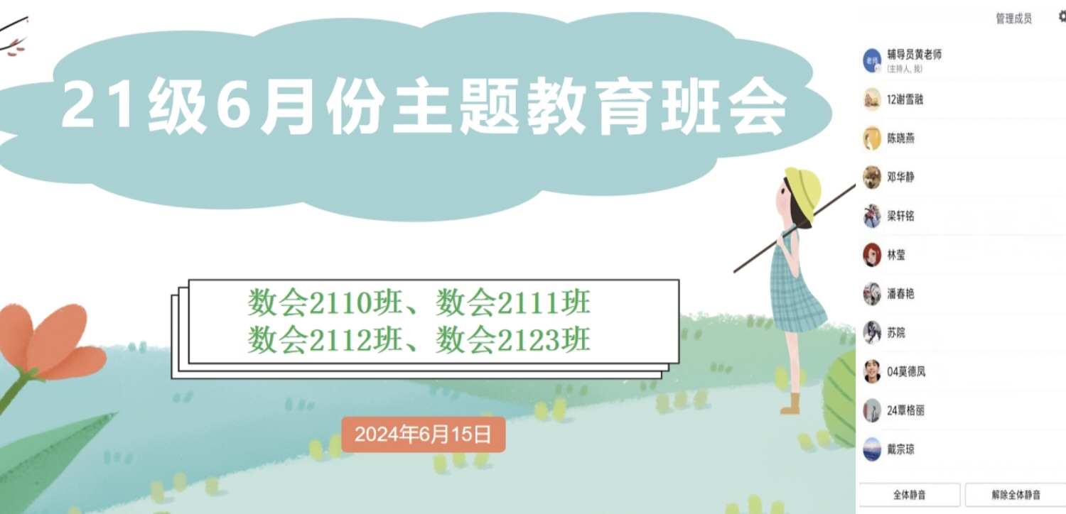 安全是生產(chǎn)的基礎(chǔ),是生活的前提。為持續(xù)推進(jìn)2024屆畢業(yè)生在校外期間各項工作安全有序進(jìn)行,數(shù)會2110班、數(shù)會2111班、數(shù)會2112班和數(shù)會2123班于2024年6月15日晚上通過騰訊會議線上召開六月份安全教育主題班會。