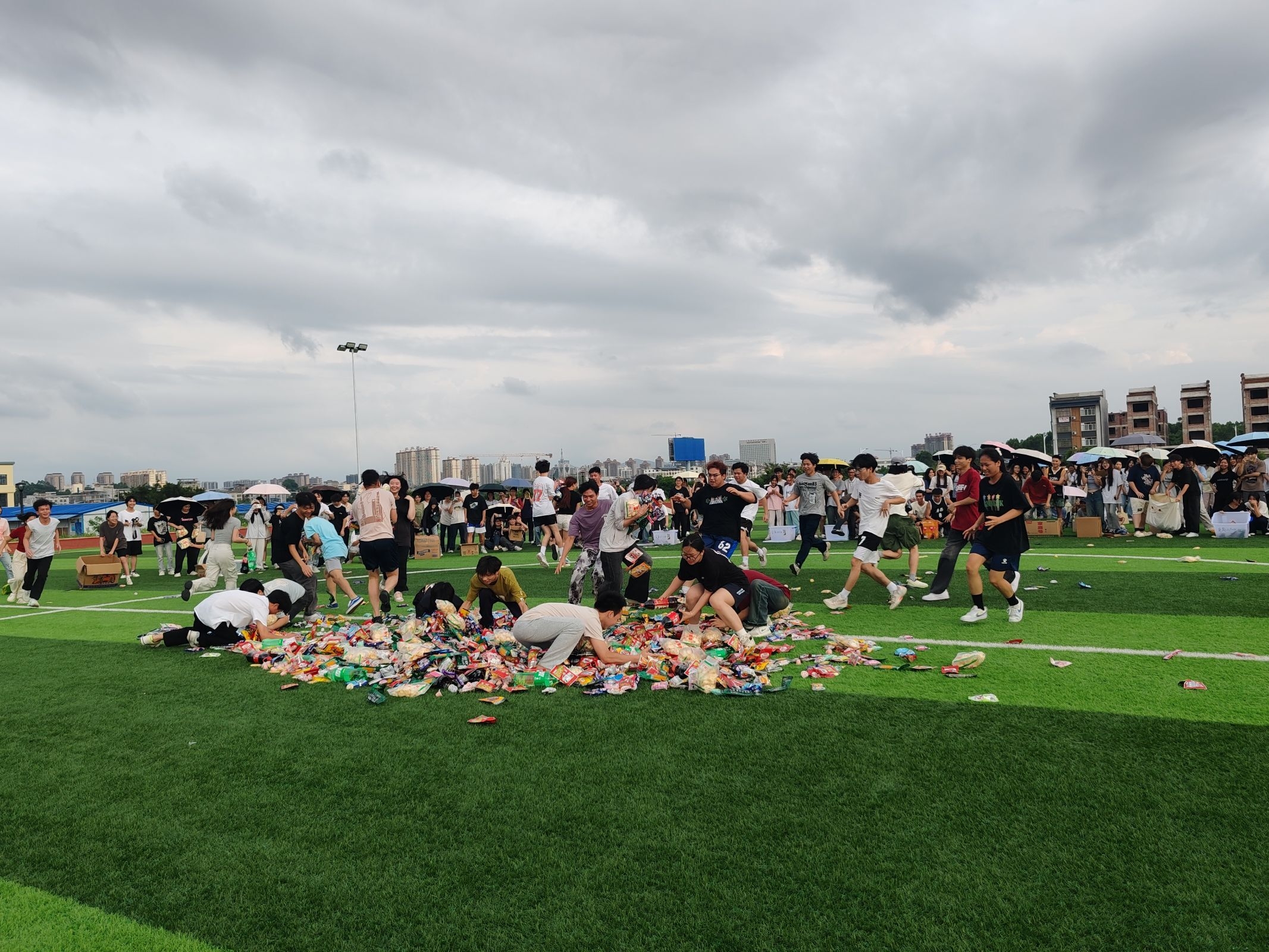 接下來是搶零食游戲。在武鳴校區(qū)西區(qū)足球場上,輔導(dǎo)員帶領(lǐng)各自班級的學(xué)生,摩拳擦掌,準(zhǔn)備大顯身手,在規(guī)定的30秒內(nèi),需用雙手環(huán)抱的方式搶奪零食,然后回到本班位置放好。裁判一聲令下,輔導(dǎo)員化身為“零食俠”,如離弦之箭,紛紛沖向指定的零食區(qū)域,輔導(dǎo)員你追我趕,爭分奪秒,生怕錯過任何一個零食。當(dāng)裁判宣布時間到時,各班都滿載而歸,臉上洋溢著滿足和喜悅的笑容。