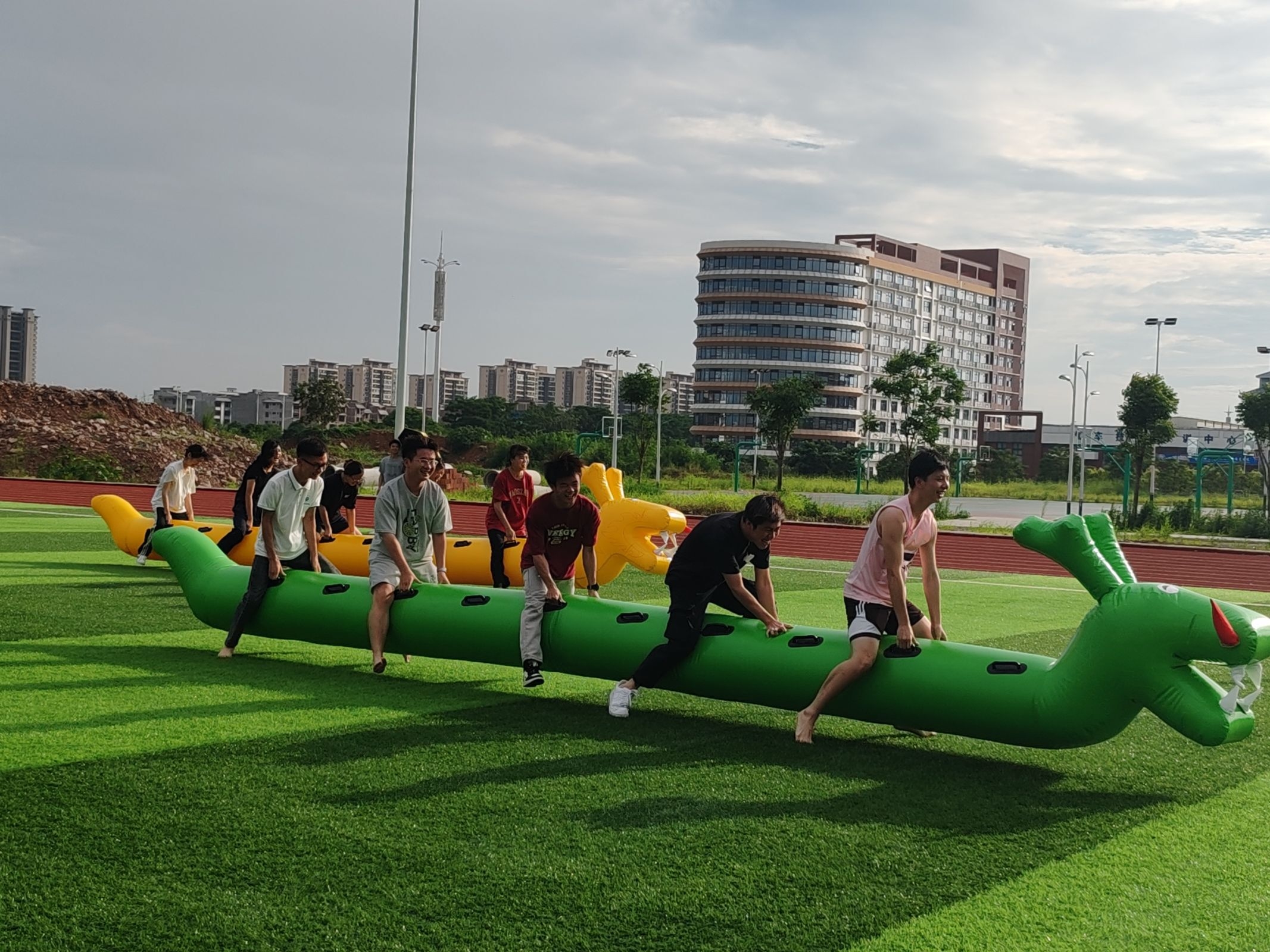 本次活動共有2個階段,首先進(jìn)行的是“地上充氣劃龍舟比賽”。這項(xiàng)活動將傳統(tǒng)文化與現(xiàn)代元素完美結(jié)合,為同學(xué)們帶來了全新的體驗(yàn)。同學(xué)們分成若干小組,每組手持船槳,齊心協(xié)力向前劃行。他們配合默契,動作協(xié)調(diào),龍舟在操場上劃出一道道美麗的弧線。