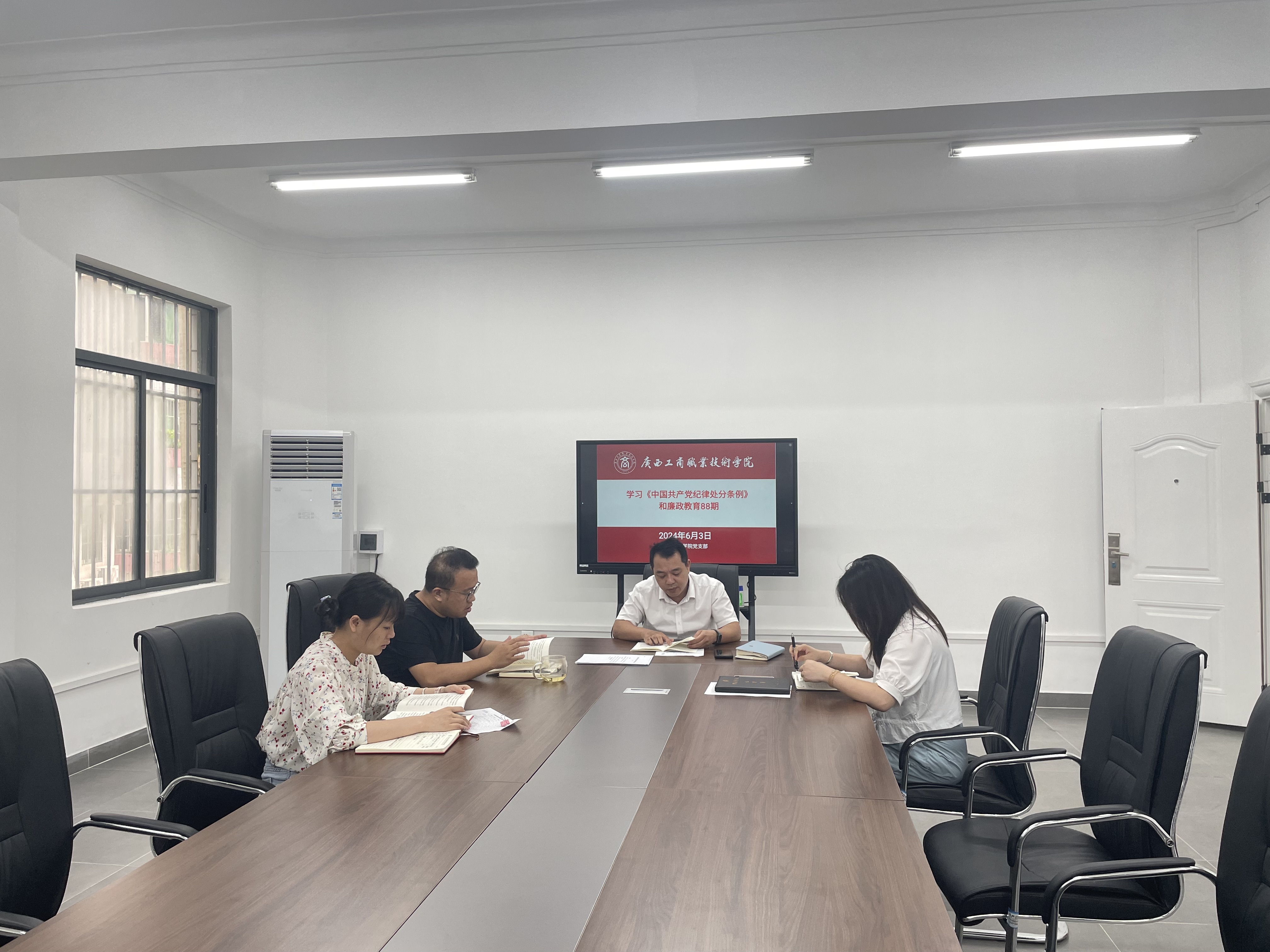 李朝鋒書記帶領(lǐng)大家原原本本地學習了《中國共產(chǎn)黨紀律處分條例》的內(nèi)容,結(jié)合部門實際情況,邊學習邊解讀,他要求大家以高度的政治自覺、思想自覺和行動自覺,深刻理解和把握《條例》的精神實質(zhì),用以規(guī)范自身的一言一行。隨后,李朝鋒書記領(lǐng)學廣西工商職業(yè)技術(shù)學院紀委辦公室、監(jiān)察室編制的廉政教育第88期內(nèi)容,從嚴重違紀違法的案例解讀中,要求大家把紀律放心上,堅定理想信念,嚴格遵守黨紀黨規(guī),守住紀律“底線”。