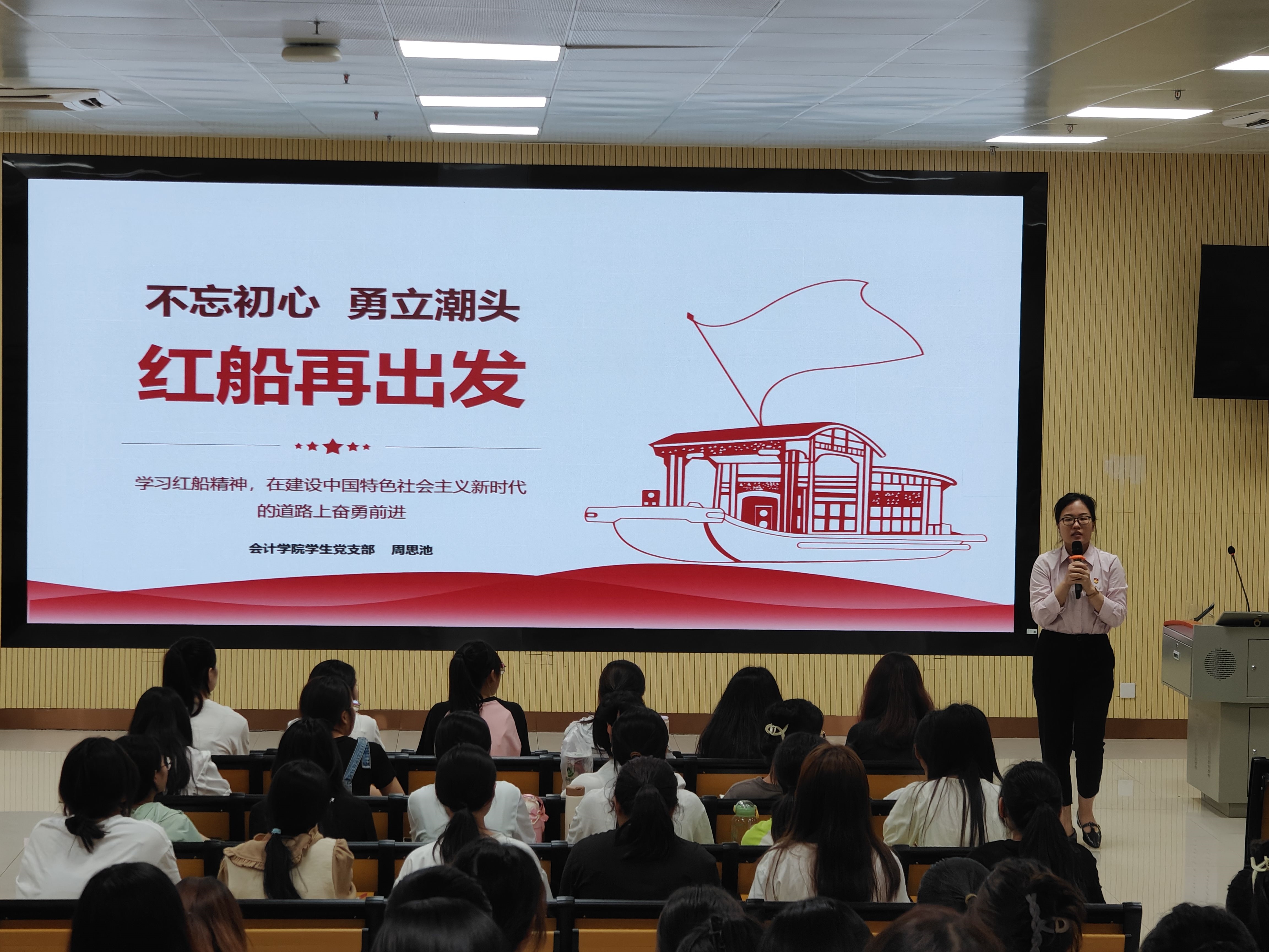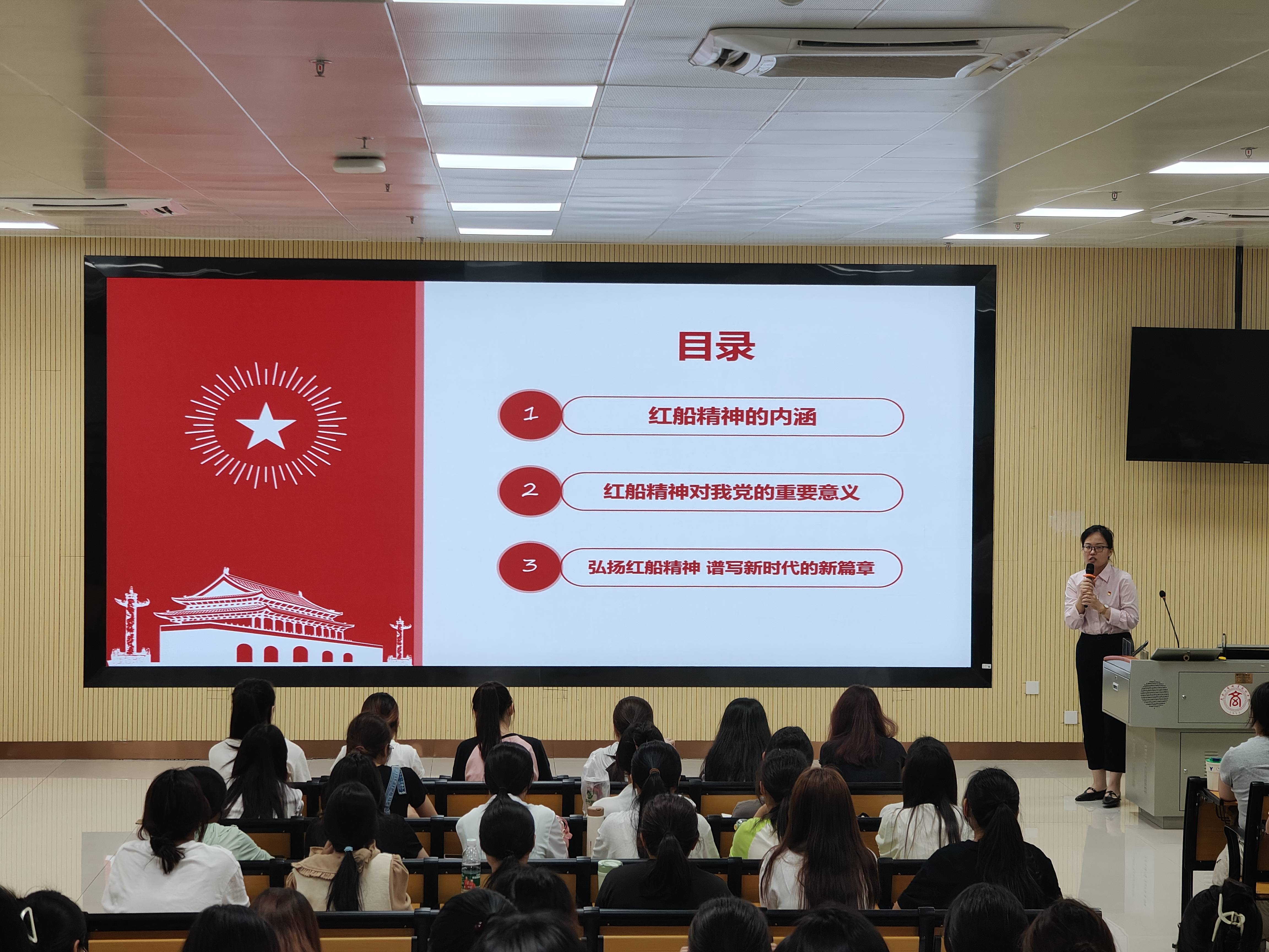 課程開始,周思池老師從紅船精神的內(nèi)涵、紅船精神對(duì)我黨的重要意義、弘揚(yáng)紅船精神,譜寫新時(shí)代的新篇章三個(gè)方面給大家講述了什么是紅船精神。紅船精神具有“開天辟地、敢為人先的首創(chuàng)精神”,“堅(jiān)定理想、百折不撓的奮斗精神”,“立黨為公、忠誠為民的奉獻(xiàn)精神”。1921年,中國共產(chǎn)黨第一次全國代表大會(huì)在浙江嘉興南湖的一條游船(后稱“紅船”)上勝利閉幕,莊嚴(yán)宣告中國共產(chǎn)黨的誕生。從此,中國的新民主主義革命就有了堅(jiān)強(qiáng)的領(lǐng)導(dǎo)者——中國共產(chǎn)黨。中國共產(chǎn)黨一直秉承紅船的創(chuàng)新精神,不斷開拓進(jìn)取,帶領(lǐng)中國人民走向民族復(fù)興。周思池老師強(qiáng)調(diào),紅船精神是重要精神航標(biāo),具有巨大的精神能量,在新時(shí)代的美好時(shí)期,弘揚(yáng)和踐行革命紅船精神將更好地激勵(lì)當(dāng)代青年大學(xué)生勇敢地?fù)?dān)當(dāng)起時(shí)代賦予的歷史使命和社會(huì)責(zé)任,促使我們勇于創(chuàng)新、艱苦奮斗、無私奉獻(xiàn),成長為實(shí)現(xiàn)中華民族偉大復(fù)興的堅(jiān)實(shí)力量。