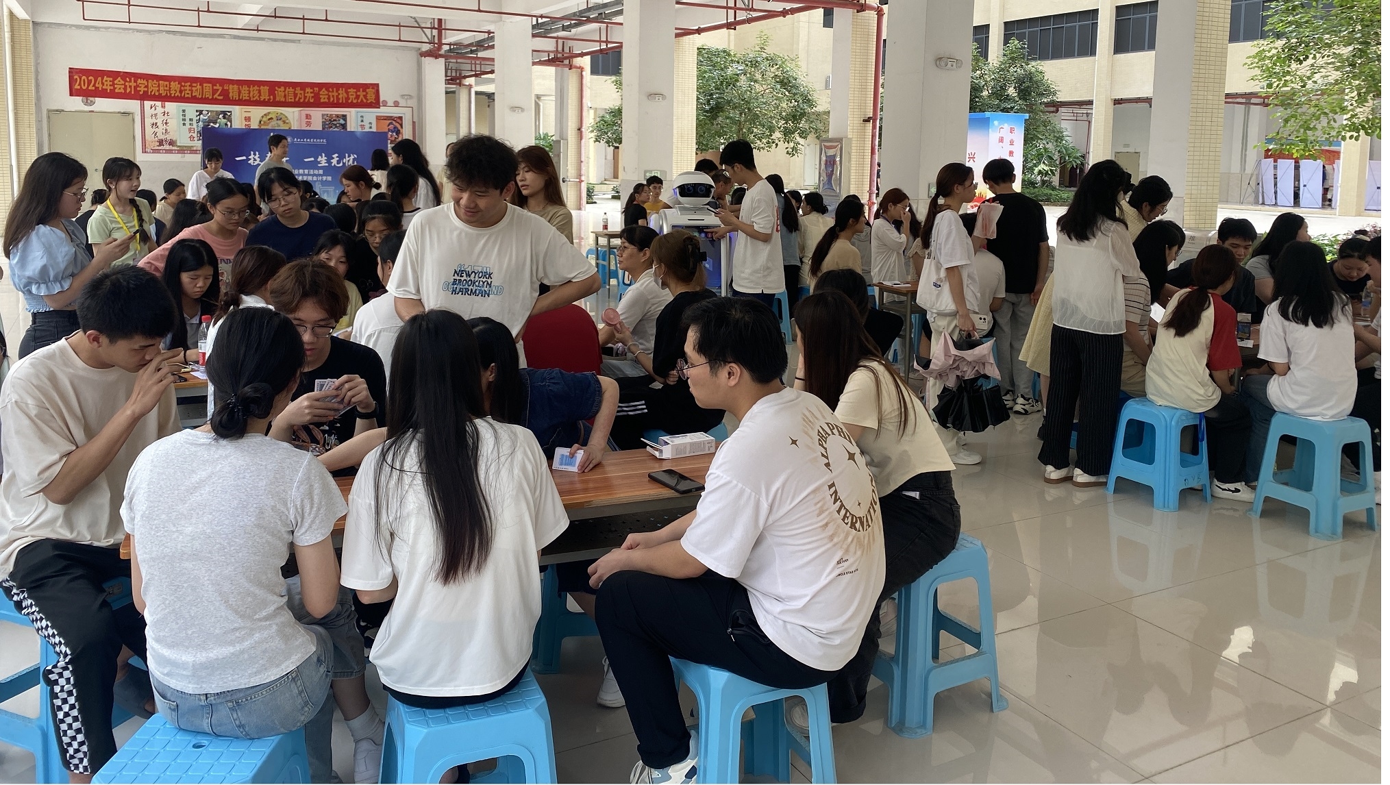 活動(dòng)周中最引人注目的環(huán)節(jié)莫過(guò)于與智慧稅務(wù)實(shí)訓(xùn)中心的智能機(jī)器人進(jìn)行互動(dòng)。這款機(jī)器人內(nèi)含會(huì)計(jì)知識(shí)問(wèn)答功能,通過(guò)大屏顯示與智能語(yǔ)音交互技術(shù)自然迅速解答疑問(wèn)。它借助數(shù)字化教學(xué)環(huán)境,直觀展示會(huì)計(jì)知識(shí),引導(dǎo)學(xué)生創(chuàng)新思維和實(shí)踐。同學(xué)們通過(guò)模擬稅務(wù)場(chǎng)景,提升實(shí)操能力,深入理解稅務(wù)工作。????此外,同學(xué)們親身感受了人工智能在職業(yè)教育中的應(yīng)用,體驗(yàn)到科技帶來(lái)的便捷和高效,對(duì)未來(lái)職場(chǎng)充滿期待。這一創(chuàng)新教學(xué)方式得到了學(xué)生的高度認(rèn)可,認(rèn)為它極大地深化了稅務(wù)實(shí)操的理解,為未來(lái)的職業(yè)發(fā)展奠定了堅(jiān)實(shí)基礎(chǔ)。???“精準(zhǔn)核算,誠(chéng)信為先”會(huì)計(jì)科目撲克比賽同樣吸引了眾多學(xué)生的目光,選手們分組競(jìng)技,選手們?cè)诰o張刺激的比賽中需迅速分析局勢(shì)、制定戰(zhàn)略,靈活調(diào)整戰(zhàn)術(shù),充分展現(xiàn)了選手們的專(zhuān)業(yè)素養(yǎng)和心理素質(zhì)。