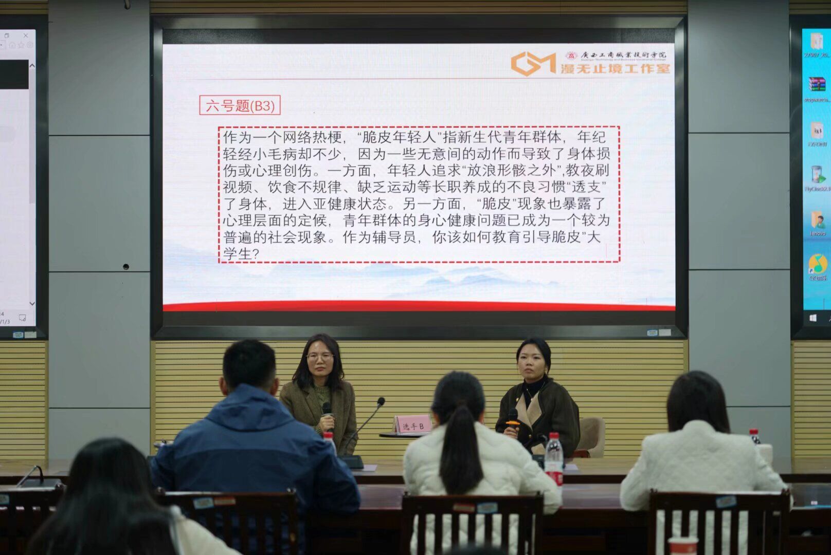 為進(jìn)一步提升我院輔導(dǎo)員的思政素養(yǎng)、業(yè)務(wù)能力與育人水平,幫助輔導(dǎo)員深入領(lǐng)悟和把握輔導(dǎo)員素質(zhì)能力大賽的比賽要領(lǐng),切實做好學(xué)校2025年輔導(dǎo)員素質(zhì)能力大賽的備賽工作,1月3日上午,經(jīng)貿(mào)學(xué)院在鵬飛校區(qū)2119會議室舉辦輔導(dǎo)員素質(zhì)能力提升營暨2025年輔導(dǎo)員素質(zhì)能力大賽賽前培訓(xùn)。廣西職業(yè)技術(shù)學(xué)院學(xué)生工作處李榮榮老師、廣西建設(shè)職業(yè)技術(shù)學(xué)院海棠工作室宋景弘老師、廣西工商職業(yè)技術(shù)學(xué)院漫無止境輔導(dǎo)員能力建設(shè)工作室主持人郭曼老師受邀作專題輔導(dǎo)培訓(xùn)與大賽經(jīng)驗分享,經(jīng)貿(mào)學(xué)院全體專職輔導(dǎo)員參加了培訓(xùn)。