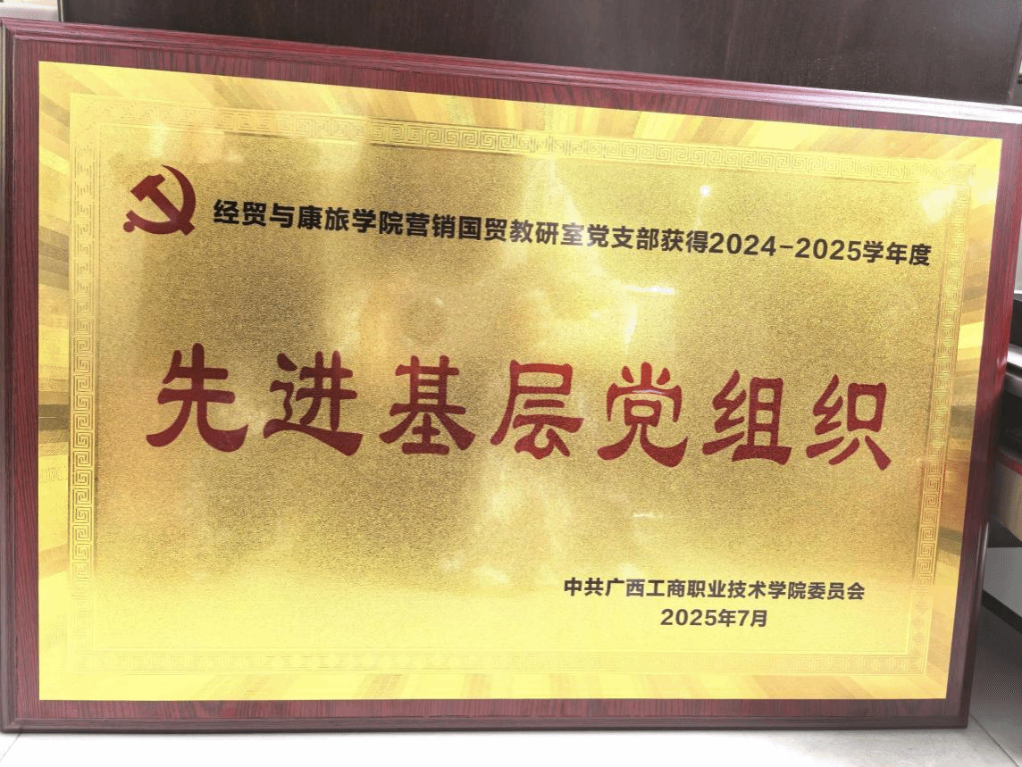 2025 年 7 月 1 日,在這個特殊的日子里,經(jīng)貿(mào)與康旅學(xué)院營銷國貿(mào)教研室被授予廣西工商職業(yè)技術(shù)學(xué)院2024-2025 學(xué)年度“先進基層黨組織”稱號。這一榮譽不僅是對教研室過去一年黨建工作的高度肯定,更是激勵全體成員繼續(xù)前行的強大動力。