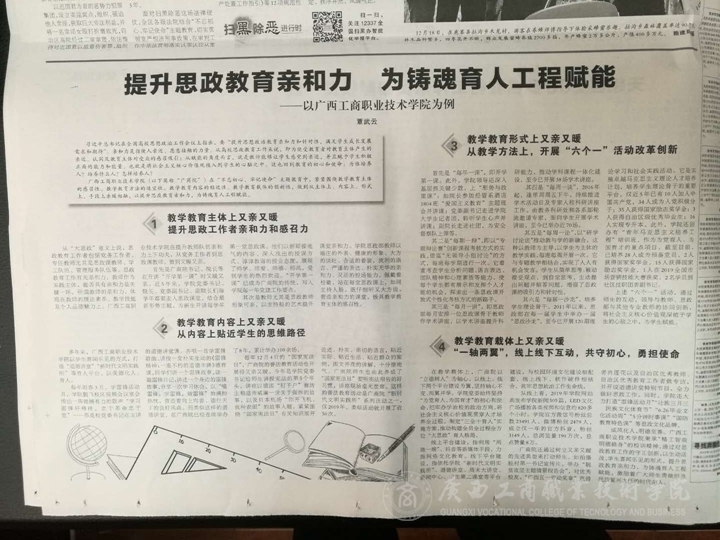 ? ? ??廣西工商職業(yè)技術(shù)學(xué)院(以下簡稱“廣商院”)在“不忘初心、牢記使命”主題教育中,緊緊圍繞教學(xué)教育主體的感召性、教學(xué)教育方法的適宜性、教學(xué)教育內(nèi)容的貼近性、教學(xué)教育載體的創(chuàng)新性,做到從主體上、內(nèi)容上、形式上、手段上親暖相融,以提升思政教育親和力,為鑄魂育人工程賦能。