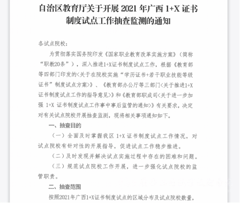 為加強(qiáng)對(duì)全區(qū)試點(diǎn)院校開(kāi)展試點(diǎn)工作的過(guò)程動(dòng)態(tài)管理與實(shí)地指導(dǎo),規(guī)范全區(qū)1+X證書(shū)制度試點(diǎn)工作的開(kāi)展,2021年10月27日上午,廣西1+X證書(shū)制度試點(diǎn)抽查監(jiān)測(cè)工作組廣西建設(shè)職業(yè)技術(shù)學(xué)院教務(wù)科研處處長(zhǎng)付春松、廣西電力...